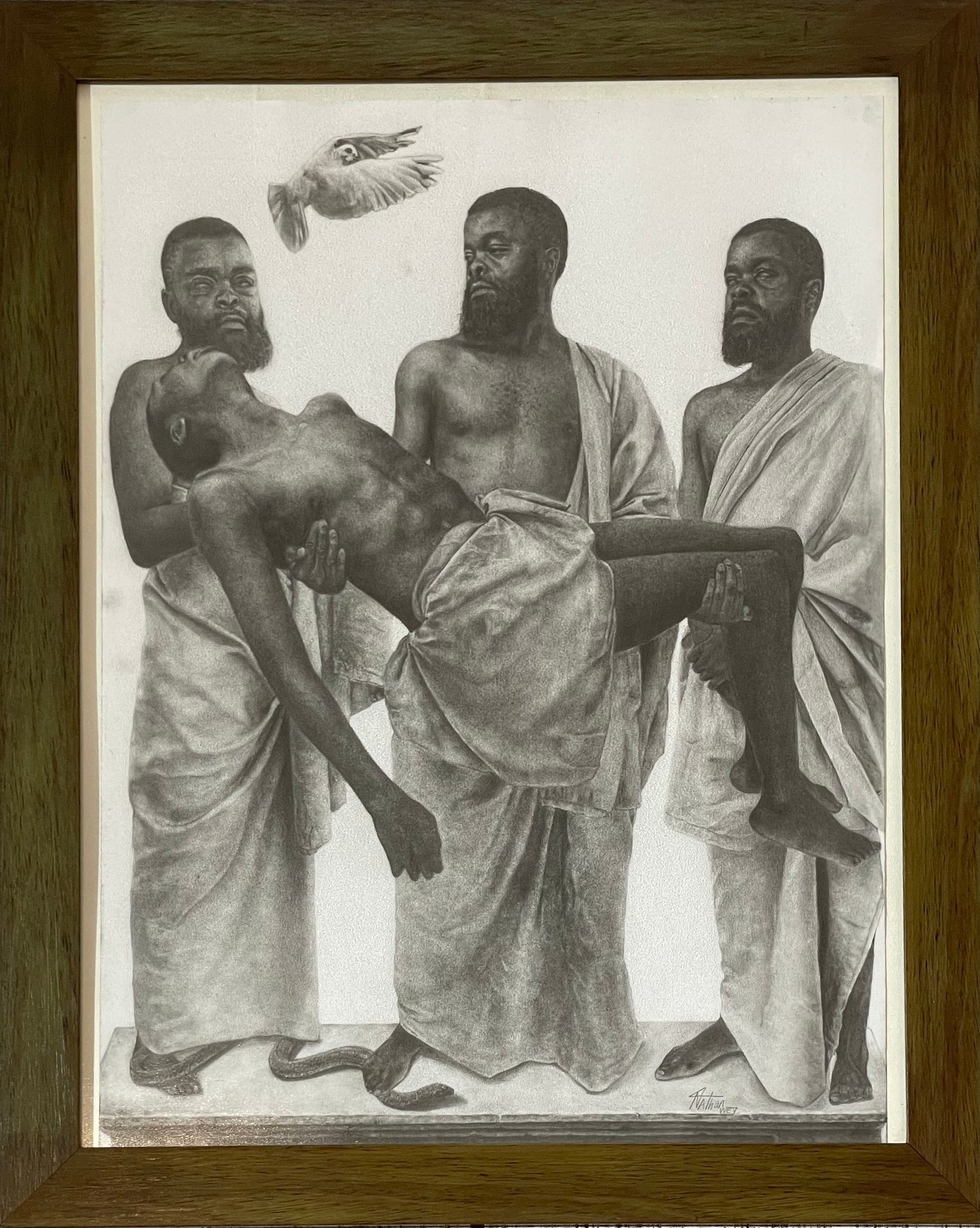 Embrace the power of sacrifice with this symbolic drawing of three men offering up another to the heavens. A white dove watches over as one man triumphantly steps on a snake, representing the triumph of good over evil. Add a touch of sophistication and depth to your home with this piece.