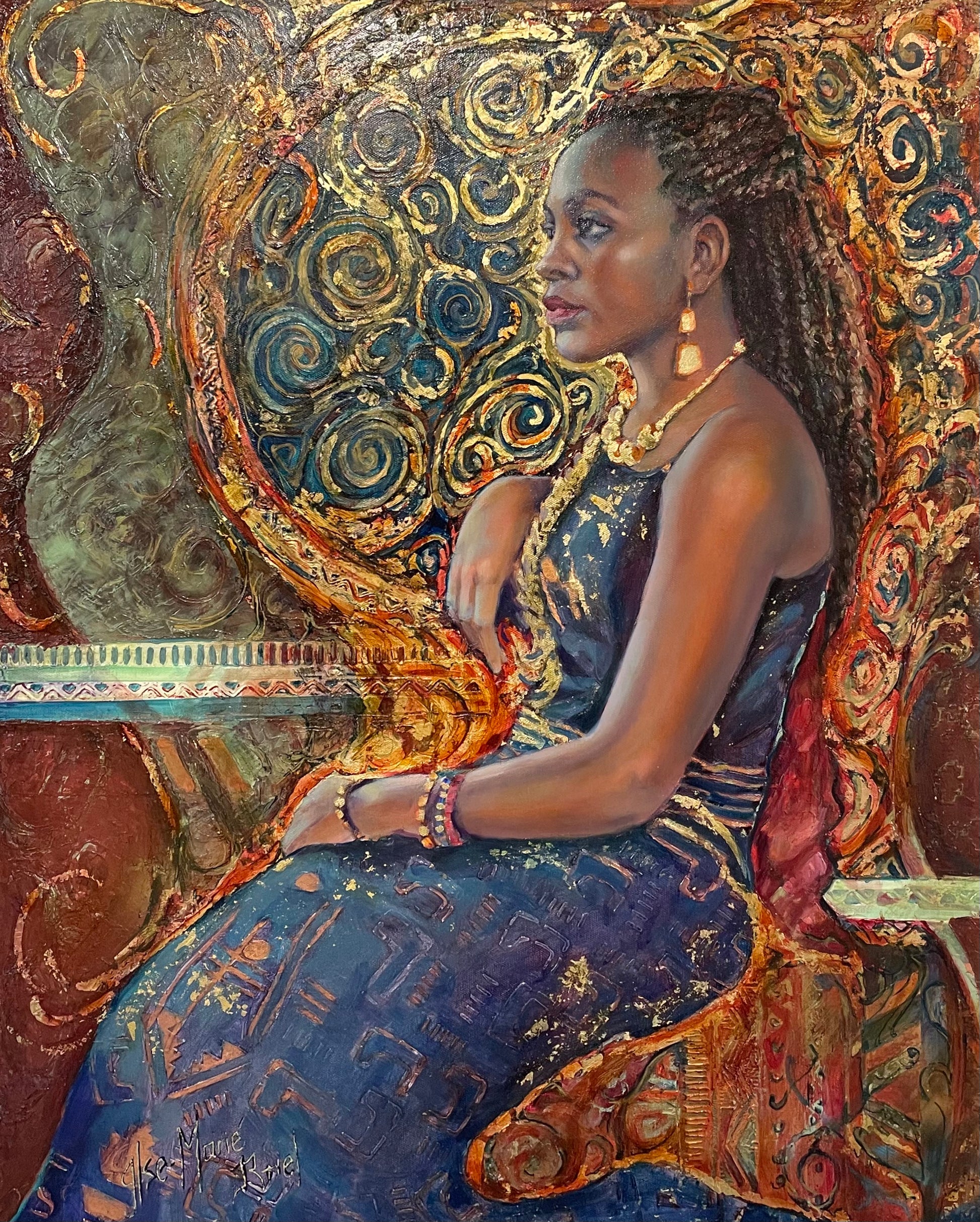 Indulge in the opulence and allure of African Klimt in gold. This exquisite oil painting captures the longing gaze of a woman seated in a chair, adding a touch of sophistication to any space. Elevate your decor with this luxurious piece and inspire admiration from all who behold it.