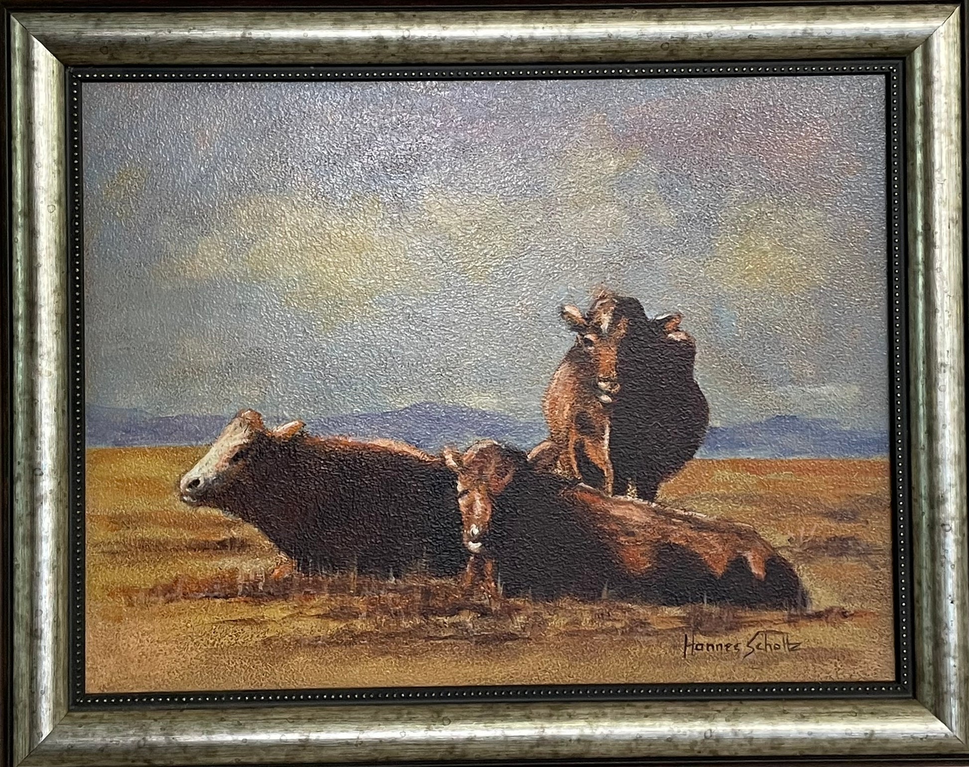 Add warm and tranquil vibes to any space with 'Afternoon Sun' - an oil painting by Hannes Scholtz featuring three relaxed cows basking in the sun. Perfect for bringing a touch of nature and calmness into your home.