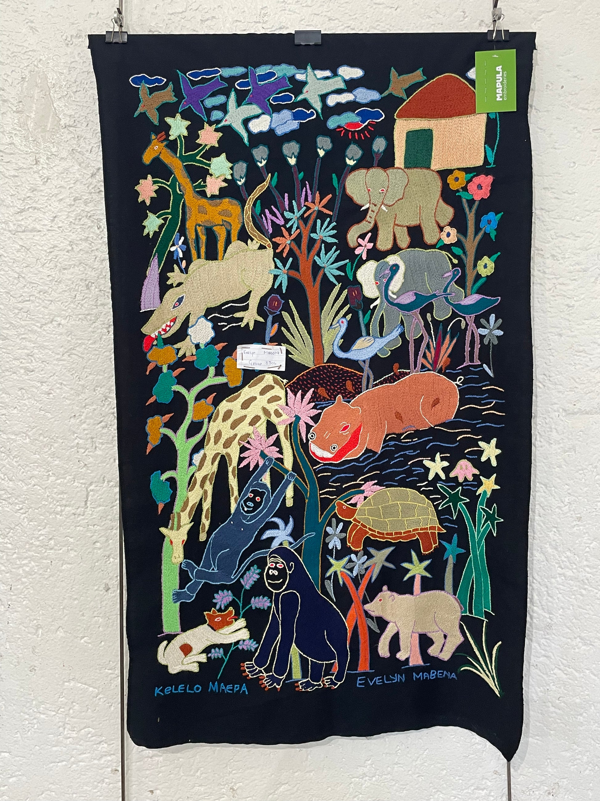 Experience the beauty and craftsmanship of Animals II, featuring a hand-embroidered storytelling format on Edenrose cotton. Each piece is created by talented artists Kelelo Maepa and Evelyn Mabena of Mapula Embroideries. The intricate details of the animals, such as the playful hippo and lovable bear, will add a touch of elegance to your home.