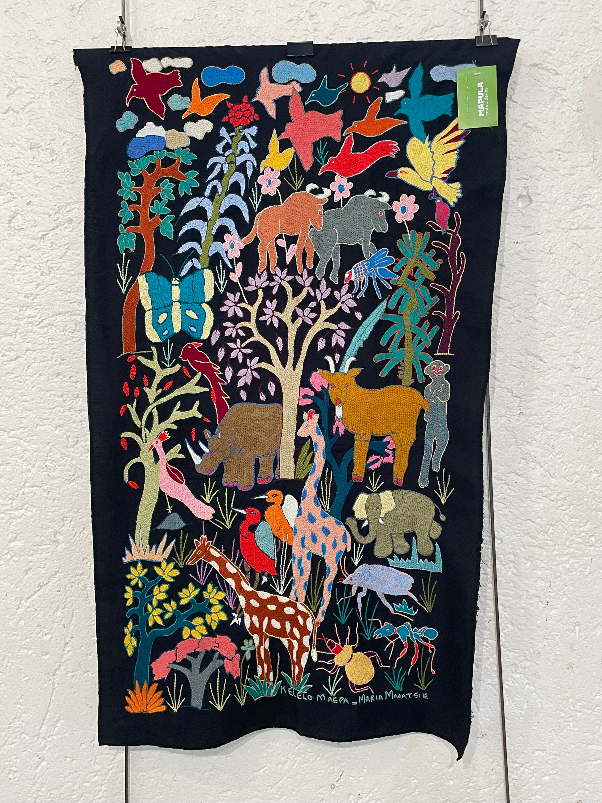 Explore the intricate world of ants and bugs with Animals III (Ants and Bugs) by Mapula Embroideries. Hand-embroidered on Edenrose cotton by talented artists Kelelo Maepa and Maria Mmatsie, this piece captures the beauty and charm of these tiny creatures in a unique storytelling format. A must-have for any nature lover and embroidery enthusiast.