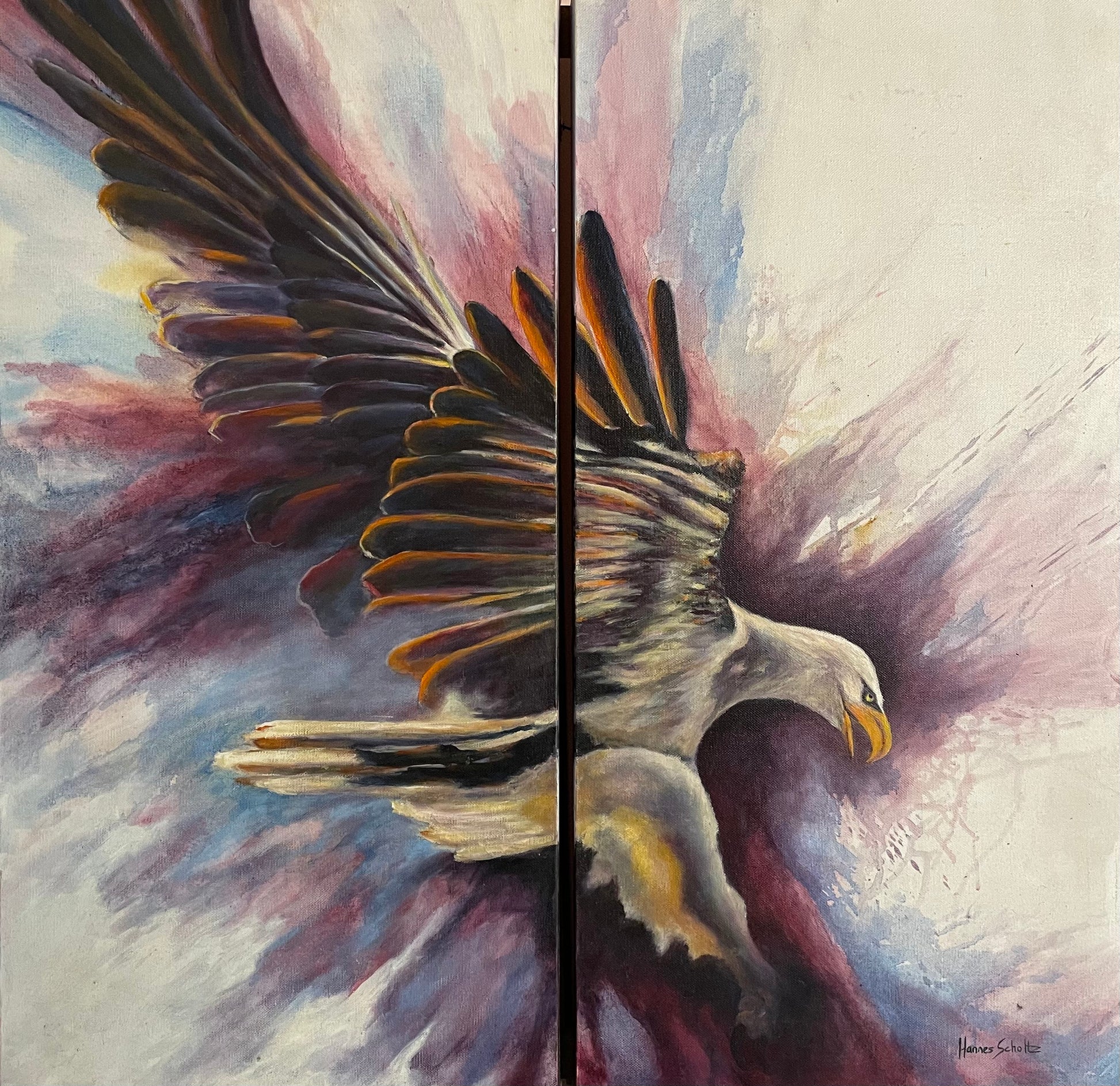 Experience the majesty of nature with Arend diptiek. This stunning diptych of oil paintings by Hannes Scholtz captures the powerful grace of an eagle in flight. Add a touch of elegance to any space and admire the mastery of this artist's work.