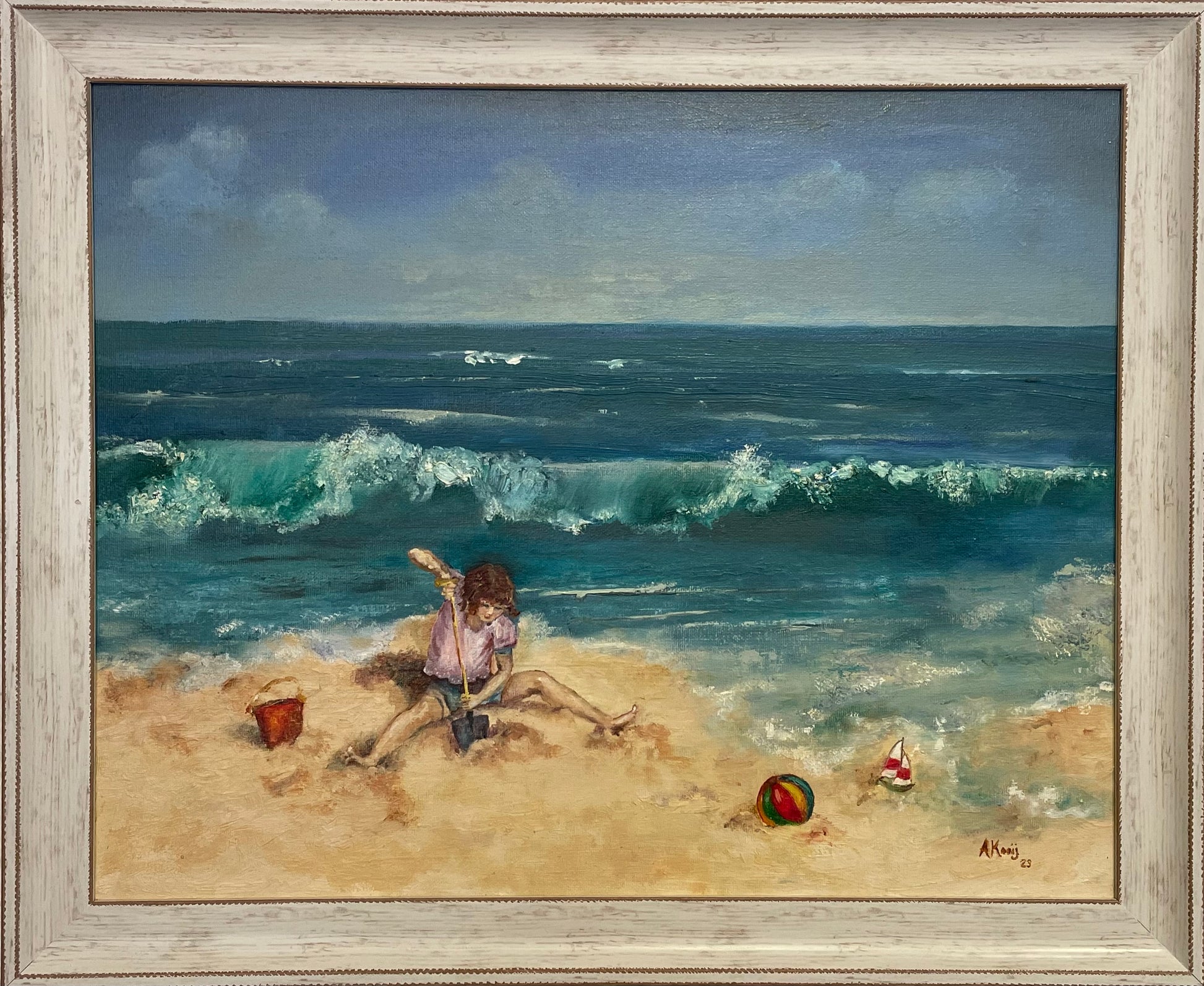 Experience the nostalgia of childhood with "At the seaside" oil painting. This sentimental piece captures the carefree joy of kids playing on a sandy beach, perfect for reliving fond memories or adding a touch of whimsy to any space. Expertly crafted with intricate details, this piece will transport you to an idyllic coastal getaway.