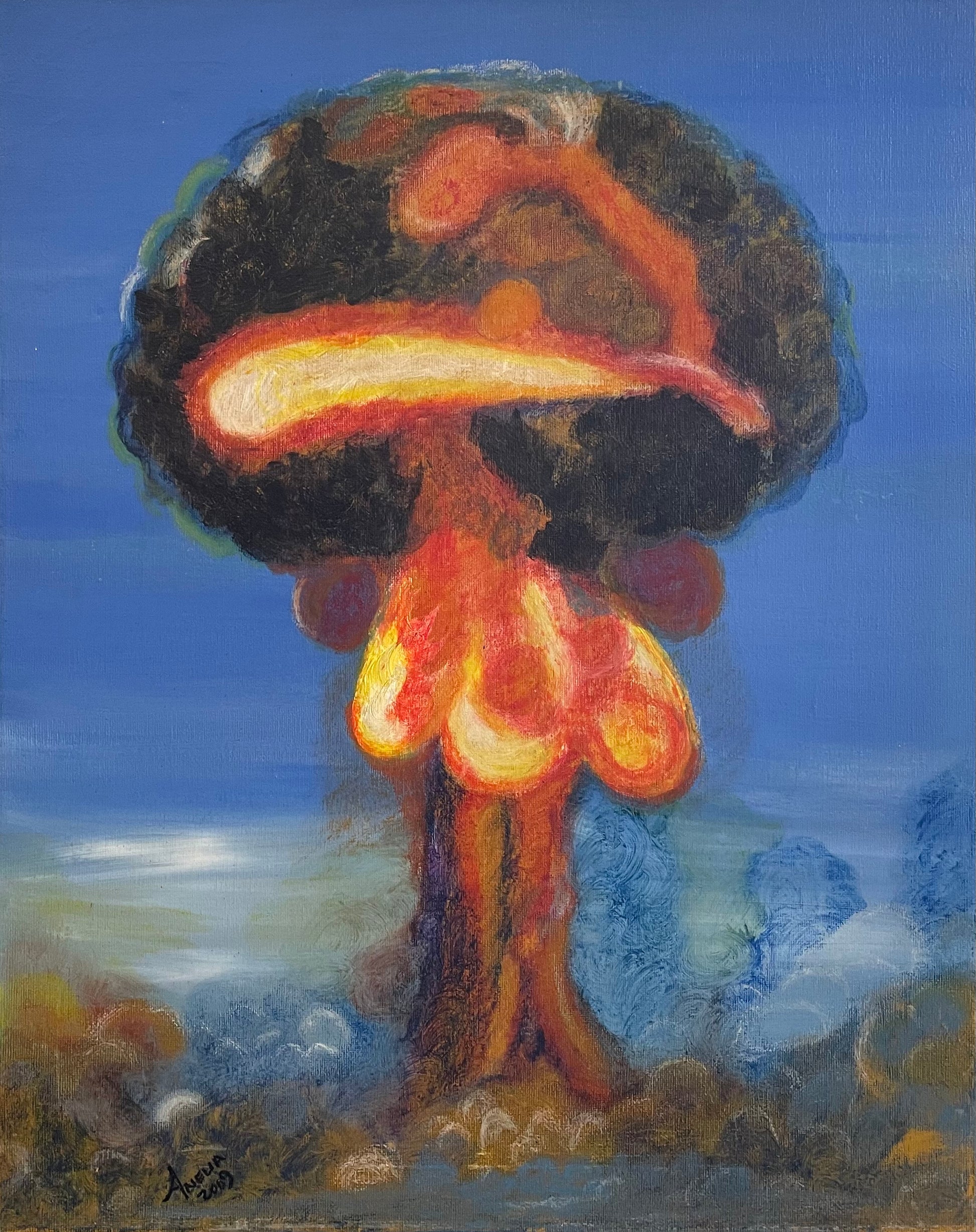 Unleash a creative explosion with Atoom Bom! This hand-painted acrylic piece by Anelia Pretorius captures the intense power of an atom bomb, symbolizing risk-taking and daring. Add this bold piece to your collection and inspire your own adventures.
