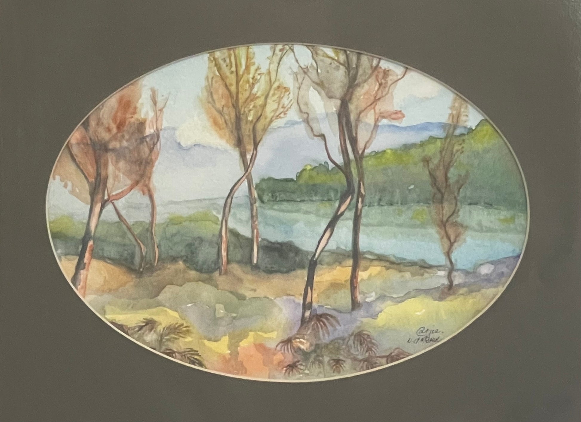 Capture the beauty of autumn with Catjie van der Merwe's watercolour painting. Take in the stunning view through colorful trees towards a serene river. A must-have for any art enthusiast looking for a tranquil and natural addition to their collection.