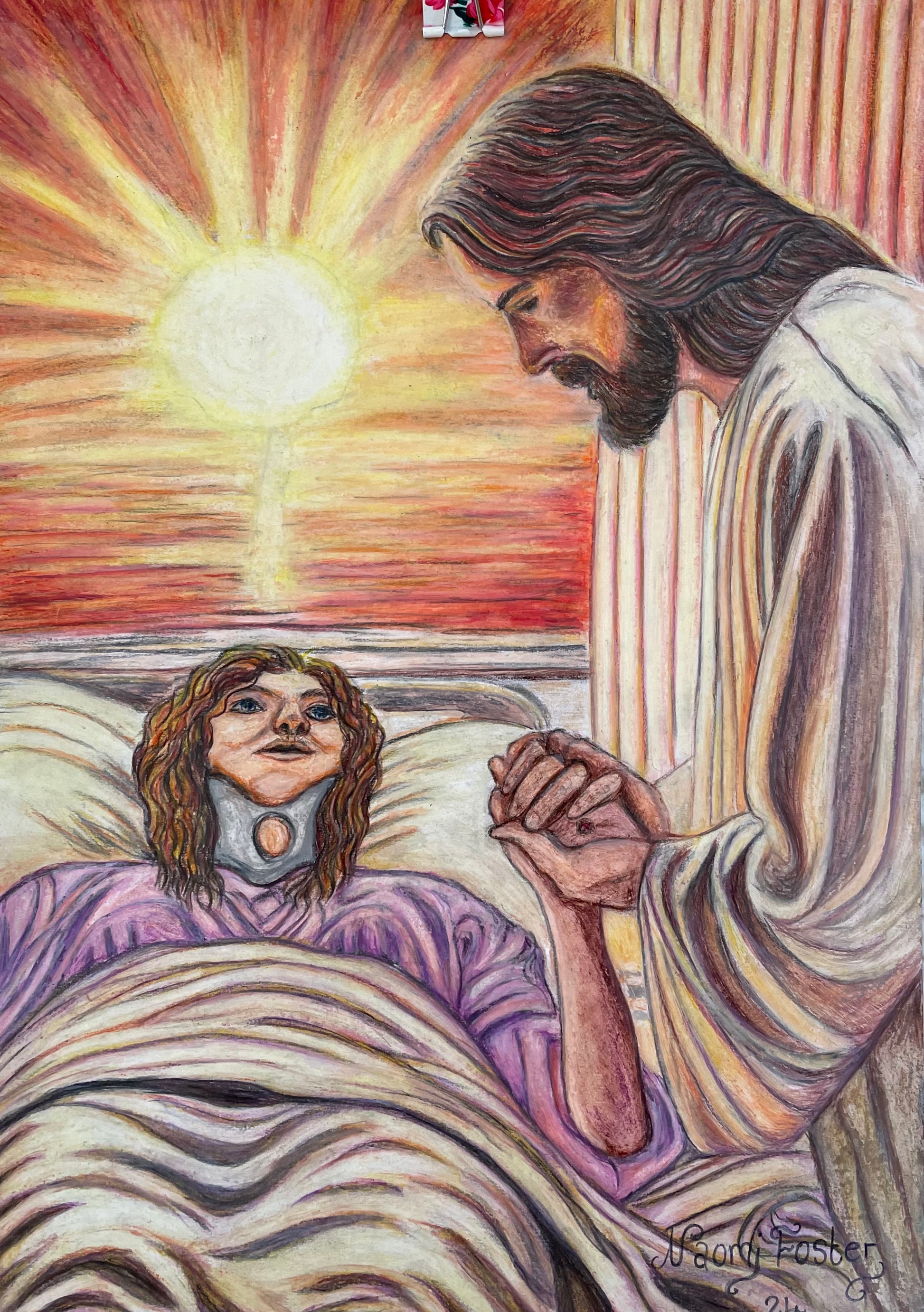 Experience the artist's own encounter with Jesus after a life-changing accident through this detailed oil pastel drawing. Naomi Foster's Awakening depicts the awakening of faith and healing, all captured in vibrant colors and intricate details. Let this artwork serve as a reminder of the power of faith and the presence of Jesus in our lives.