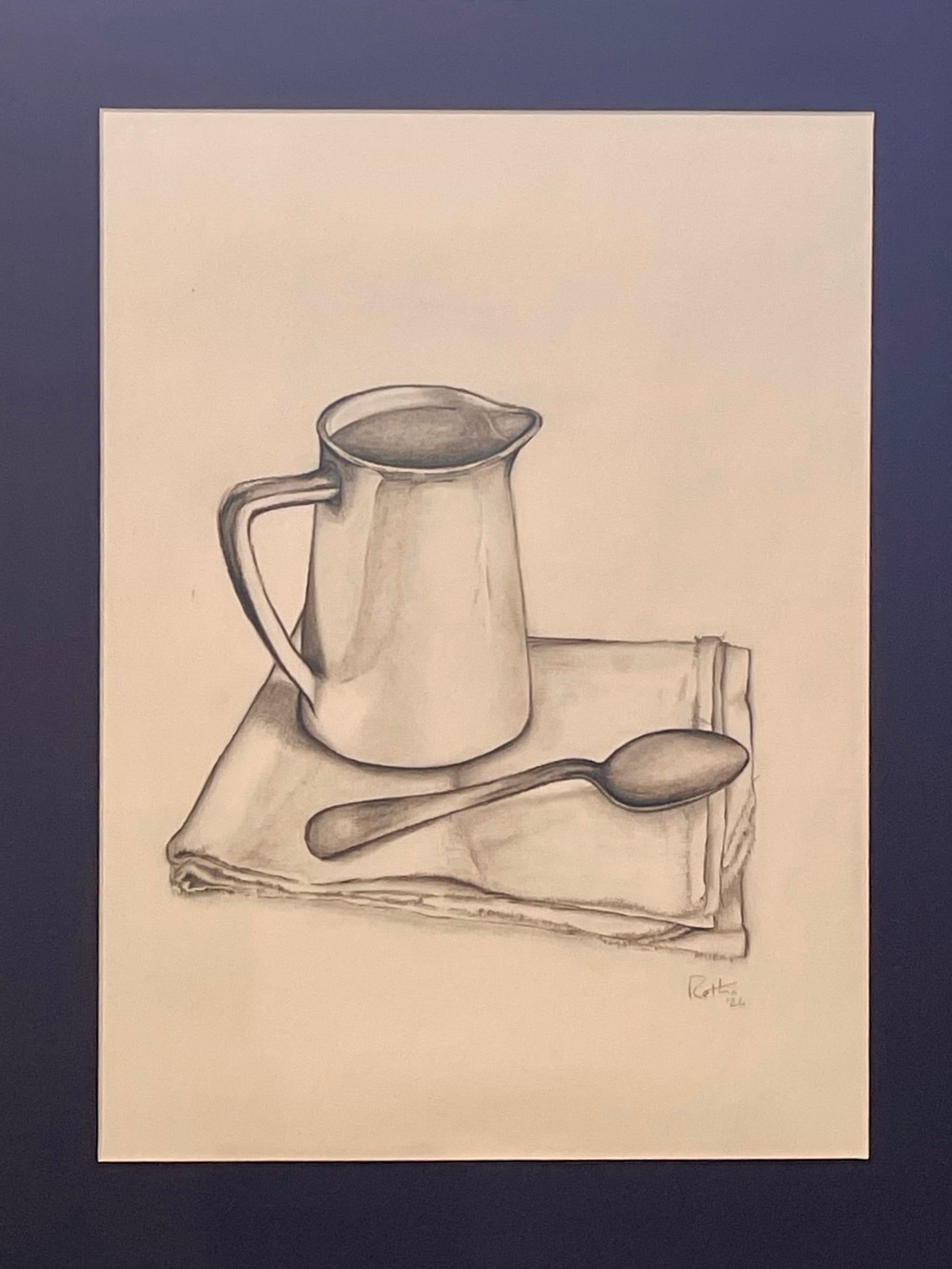 Simplicity is beautiful. This still life charcoal drawing by Retha Fourie captures the elegance of a silver jug and spoon on a soft cloth. The intricate details and subtle shading will add a touch of sophistication to any room, making it the perfect piece for any art lover's collection.