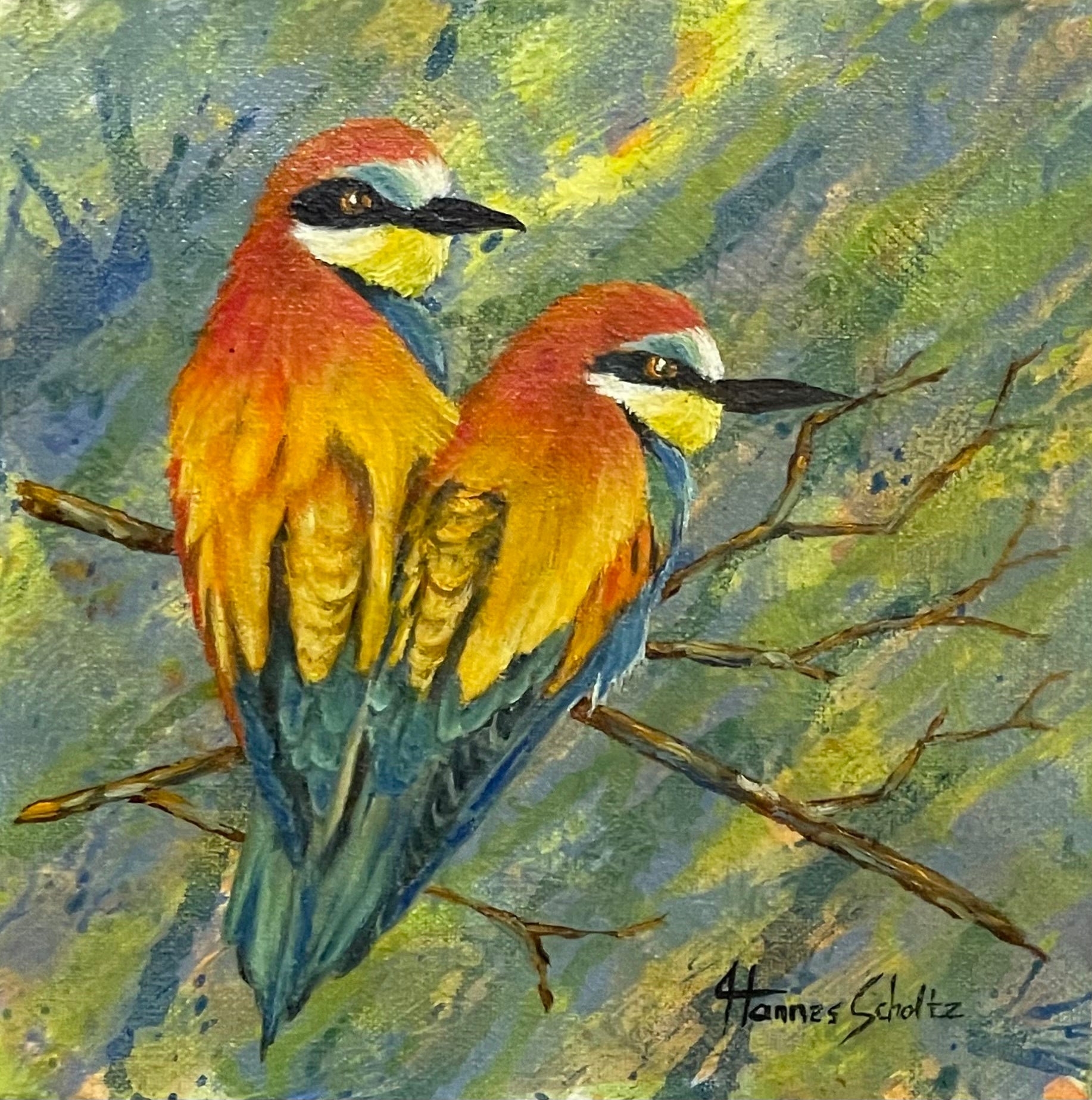 Experience the beauty and love of nature with Bee Eater 2. This stunning oil painting by Hannes Scholtz captures two bee eaters sitting on a branch, their bodies forming a heart. Adorn your space with this elegant masterpiece and feel the warmth and charm of these birds.