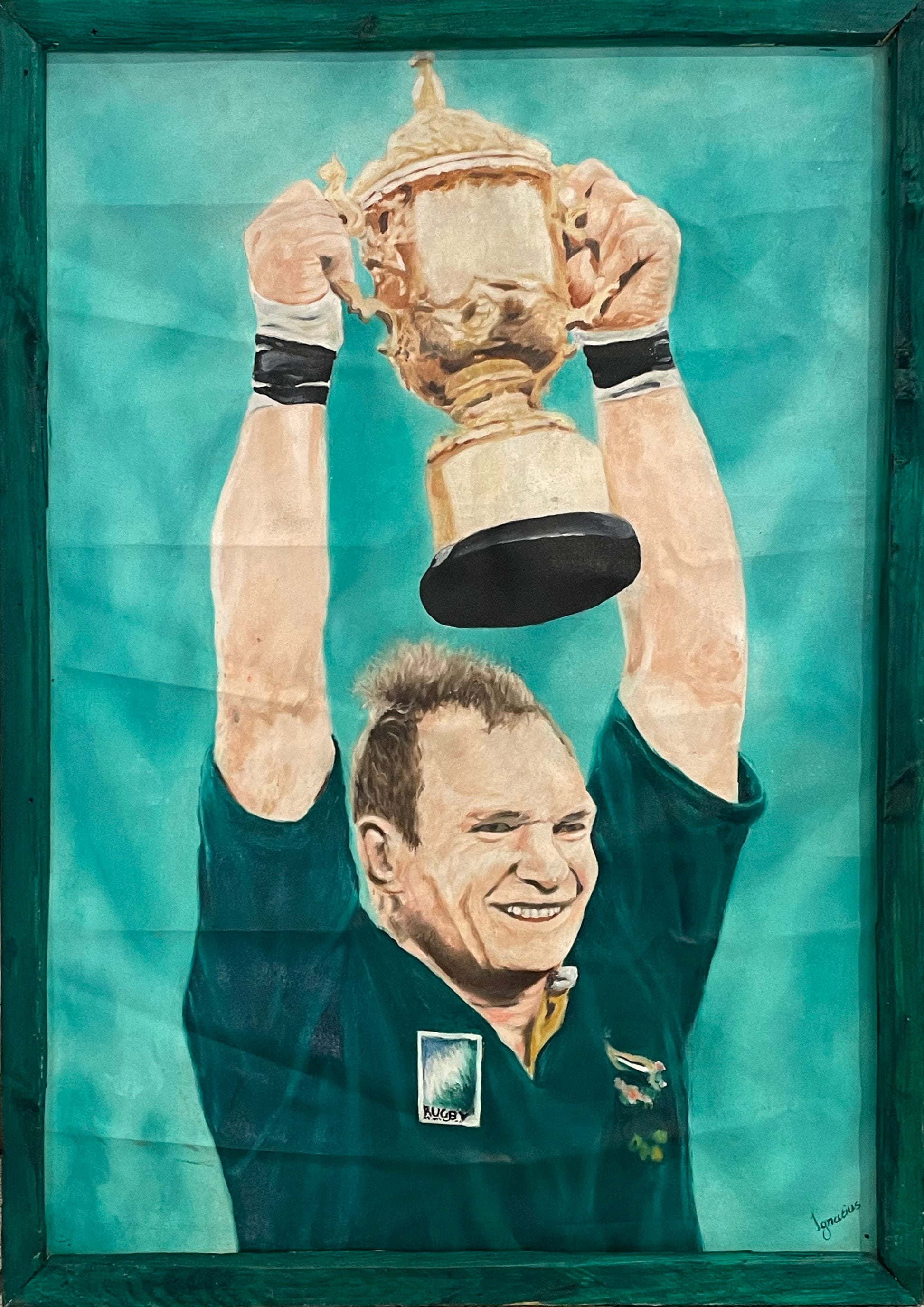 Experience the iconic moment of victory with Beginning of Dominance - a stunning oil painting by Ignatius Manzini that captures Francois Pienaar's triumphant lift of the 1995 Rugby World Cup trophy. A must-have for any sports enthusiast or art collector.