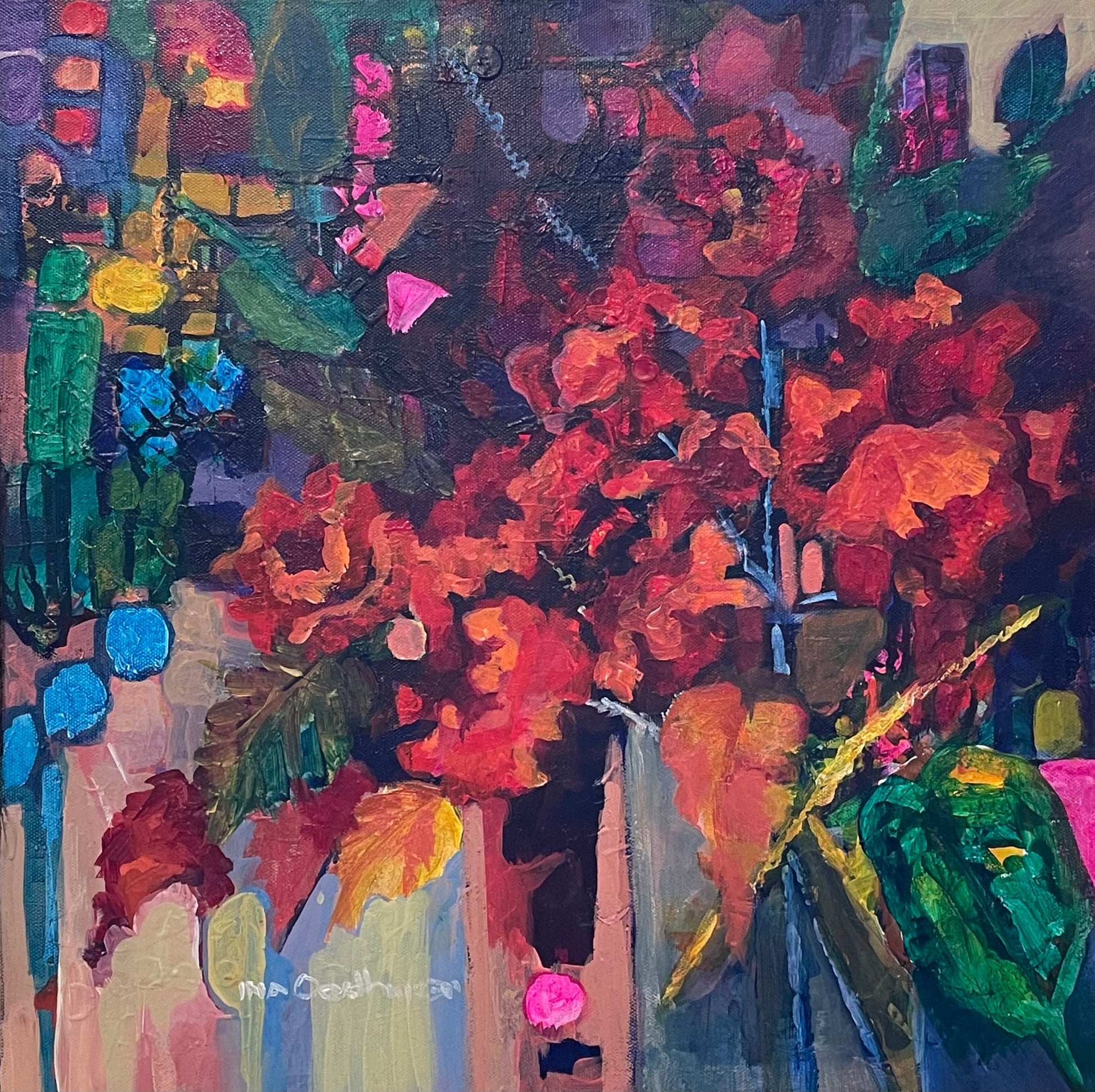 Unleash your daring spirit with 'Behind the Lead Glass,' a vibrant abstract acrylic painting by Ina Oosthuizen. With bold brushstrokes and a blurred bouquet of flowers, this piece captures the thrill of seeing beauty through a stained window.