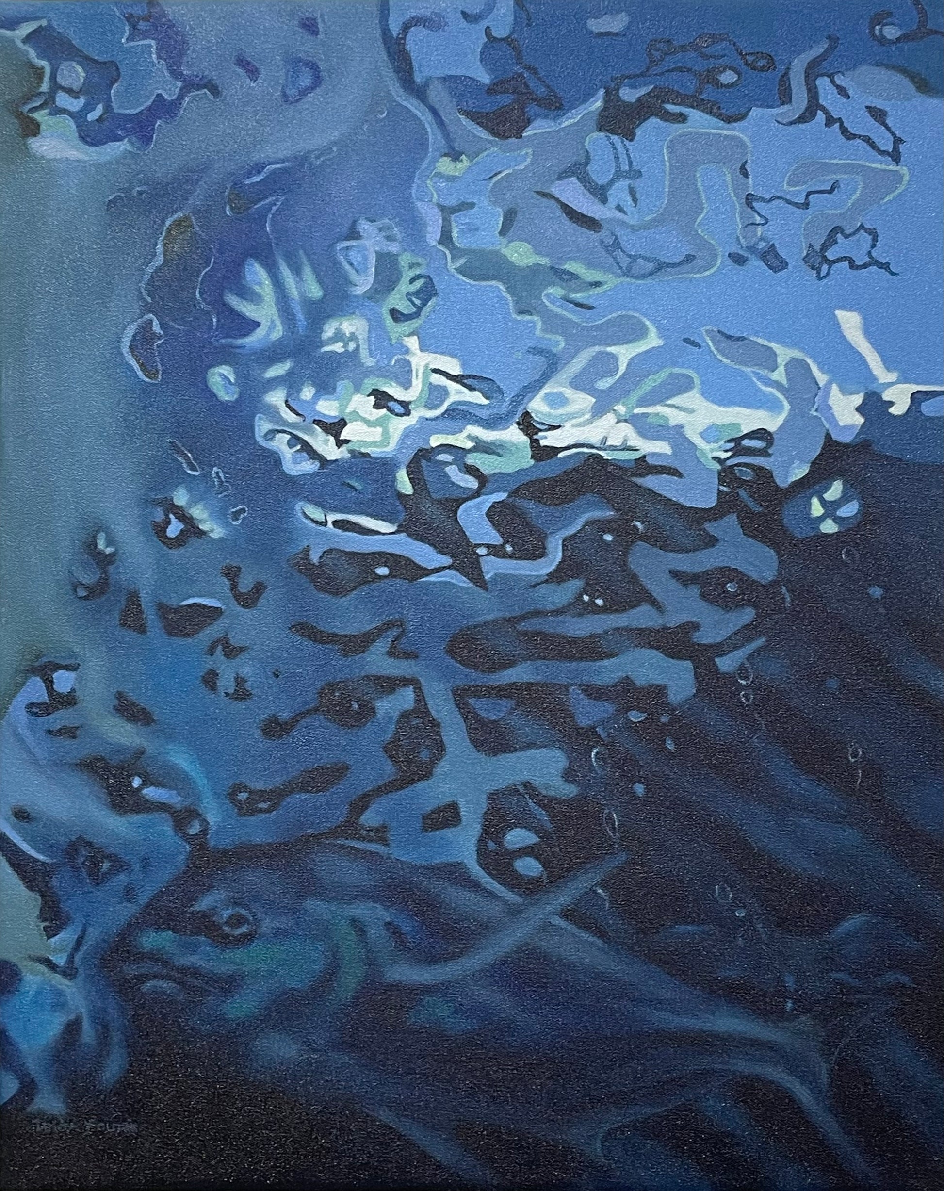 Experience the thrill of the unknown with Blue Depth II, an oil painting by Linda Fourie that puts you in the perspective of a fish looking up at us from below the water's surface. See the world in a whole new way with this unique piece.