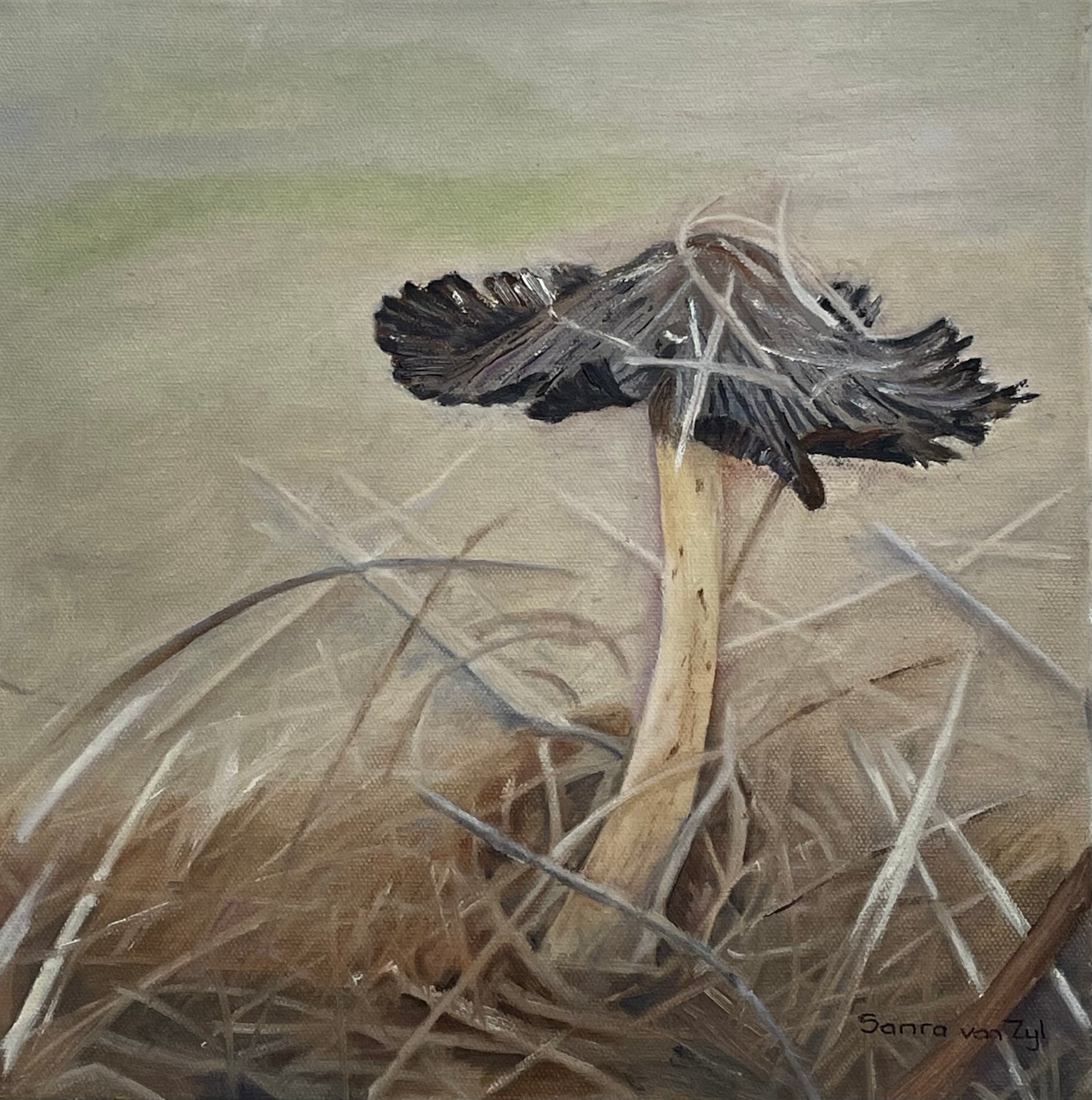 Experience the magic of growth with Captured Movement. This oil painting captures the fleeting moment of a mushroom's expansion, expertly depicted by Sanra van Zyl. A stunning addition to any art collection.