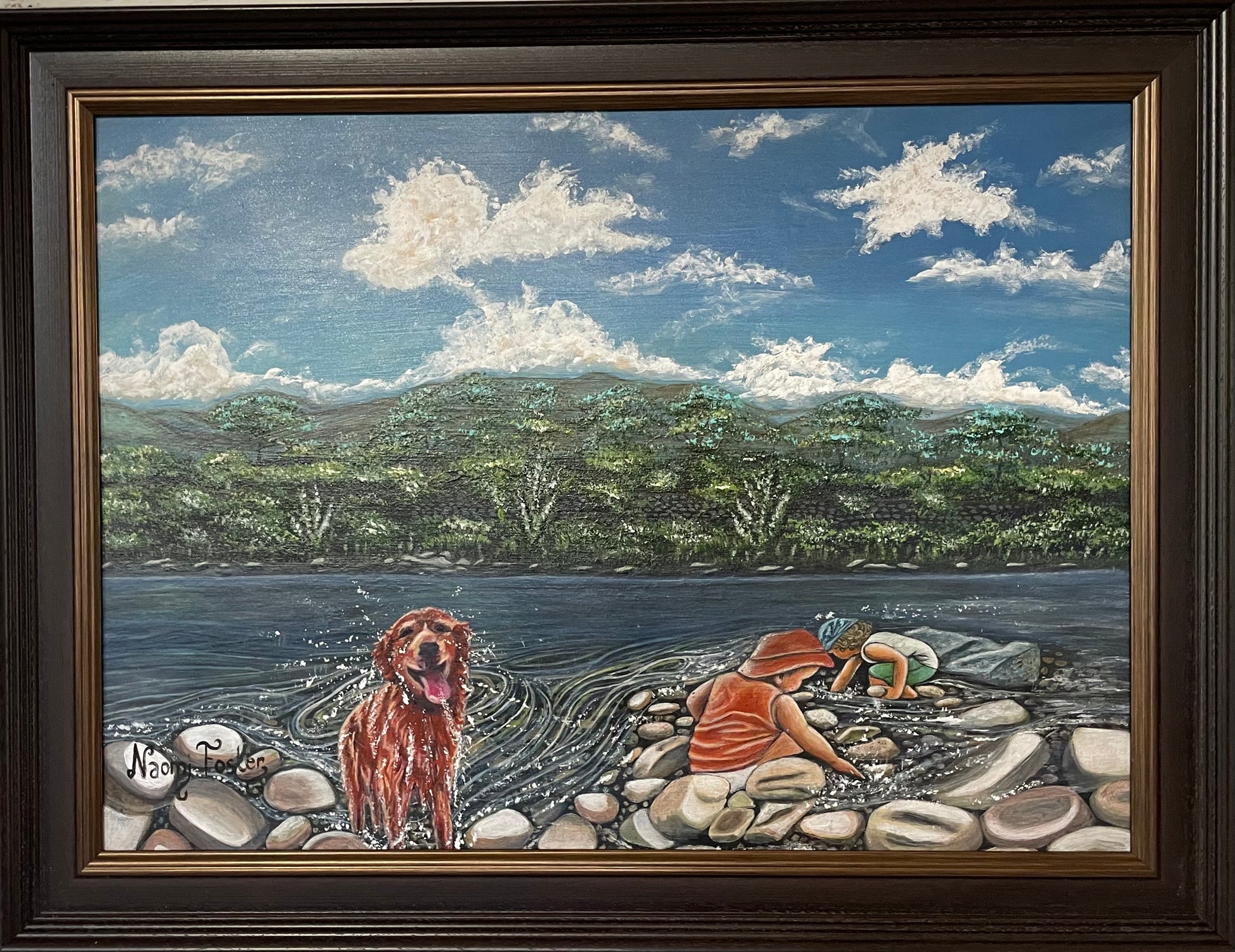 This childhood memory captured in an acrylic painting by Naomi Foster depicts two children and their beloved dog, Red, playing along the edge of a river. The vibrant colors bring life to this nostalgic scene, making it a perfect addition to any art collection.