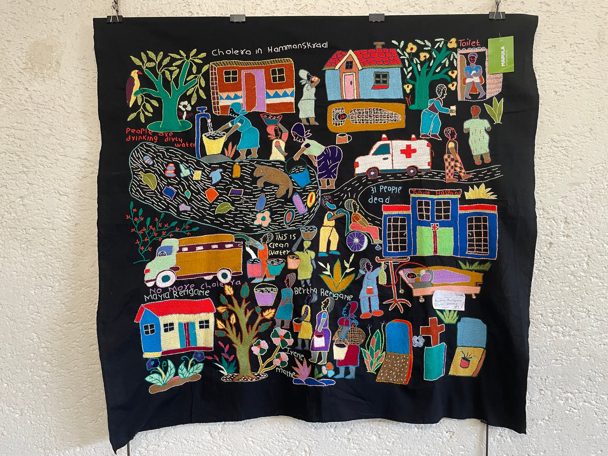 Indulge in the exquisite craftsmanship of Cholera in Hammanskraal. Each piece is hand embroidered on Edenrose cotton by Mapula Embroideries, showcasing the skill of the artists. Elevate your home decor with this unique and exclusive piece.