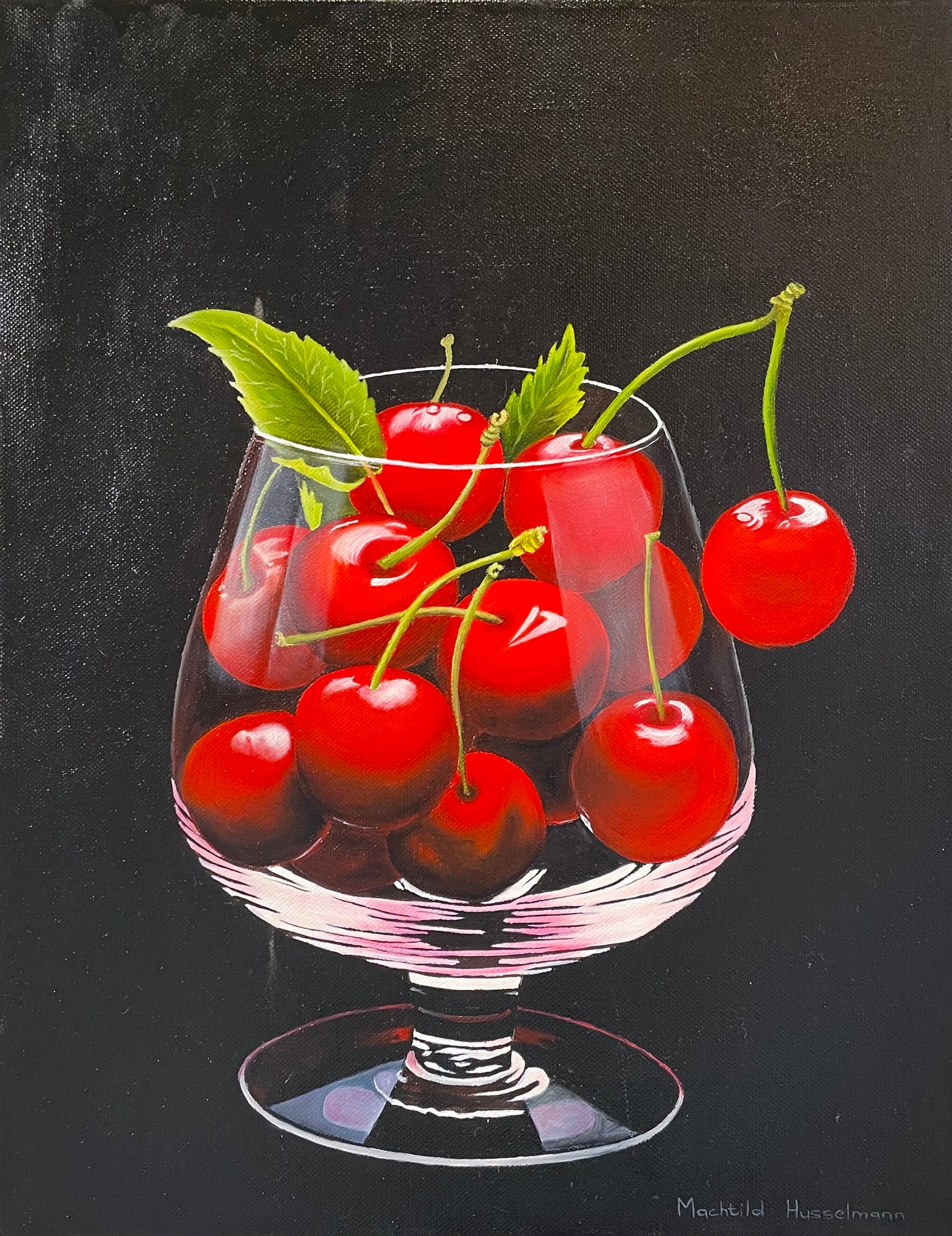 Experience the masterful artistry of renowned artist Machtild Husselmann with this oil painting of a cognac glass and cherries.