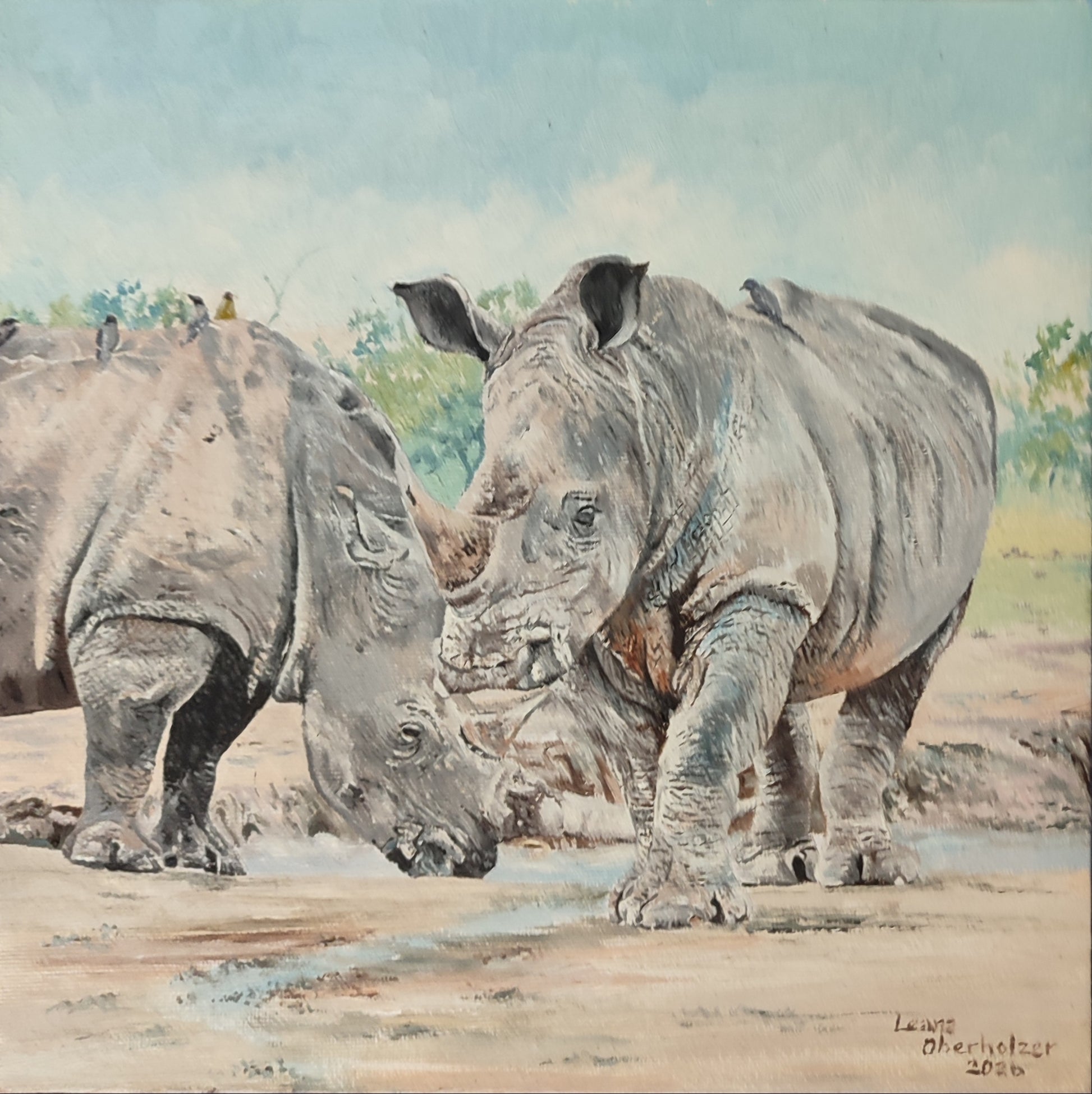 Two majestic rhinos gather at a tranquil watering hole in this striking wildlife painting. Rendered with rich detail and muted earth tones, the composition captures a serene moment in nature—perfect for adding warmth and character to any space. This piece celebrates the beauty and strength of these magnificent creatures, making it an ideal choice for wildlife enthusiasts and art lovers who appreciate authentic African imagery.