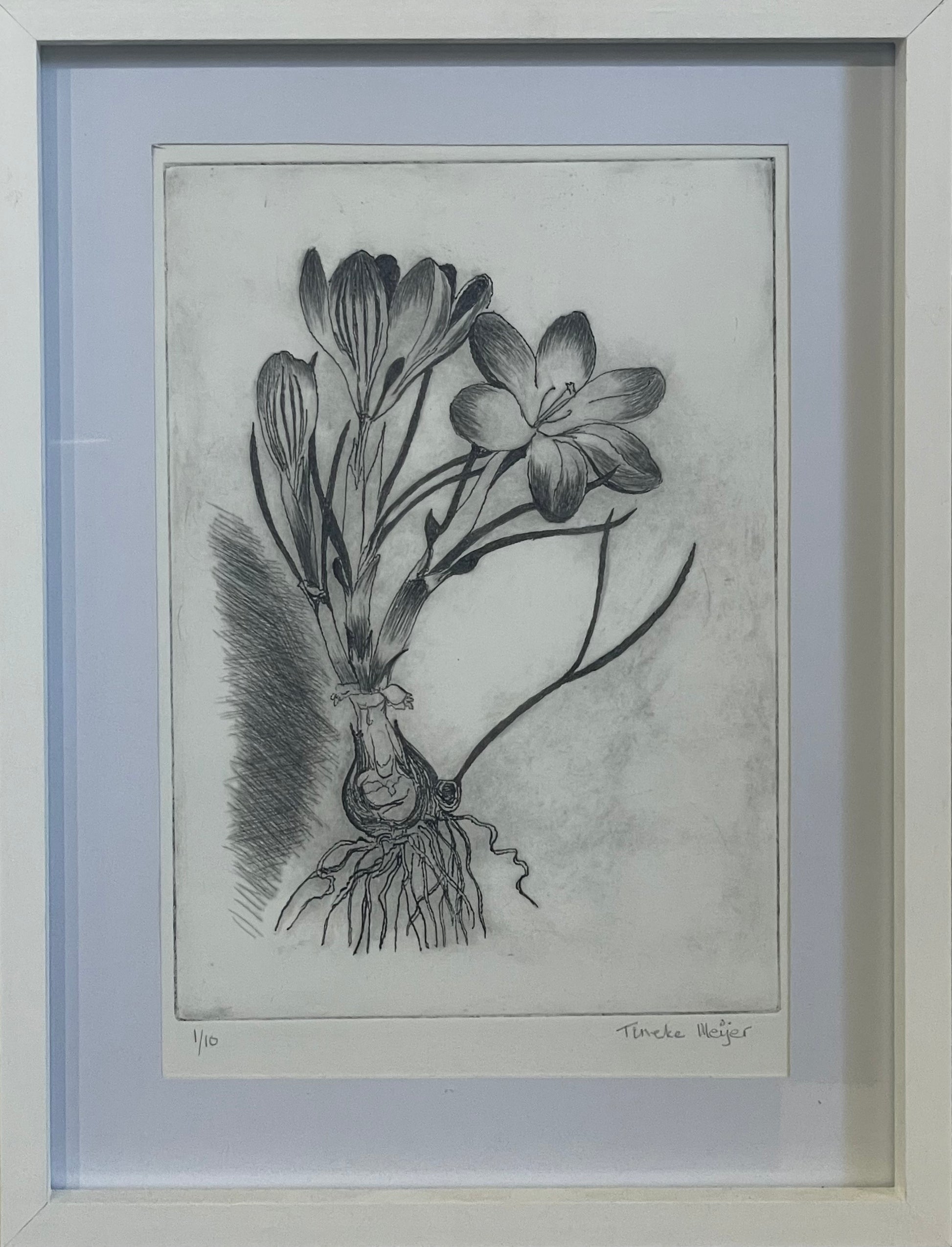 This dry point etching print of a corcus lilly, created by artist Tineke Meijer, captures the delicate details and vibrant colors of the flower. The precise technique of etching adds depth and texture to the image, making it a stunning addition to any art collection.