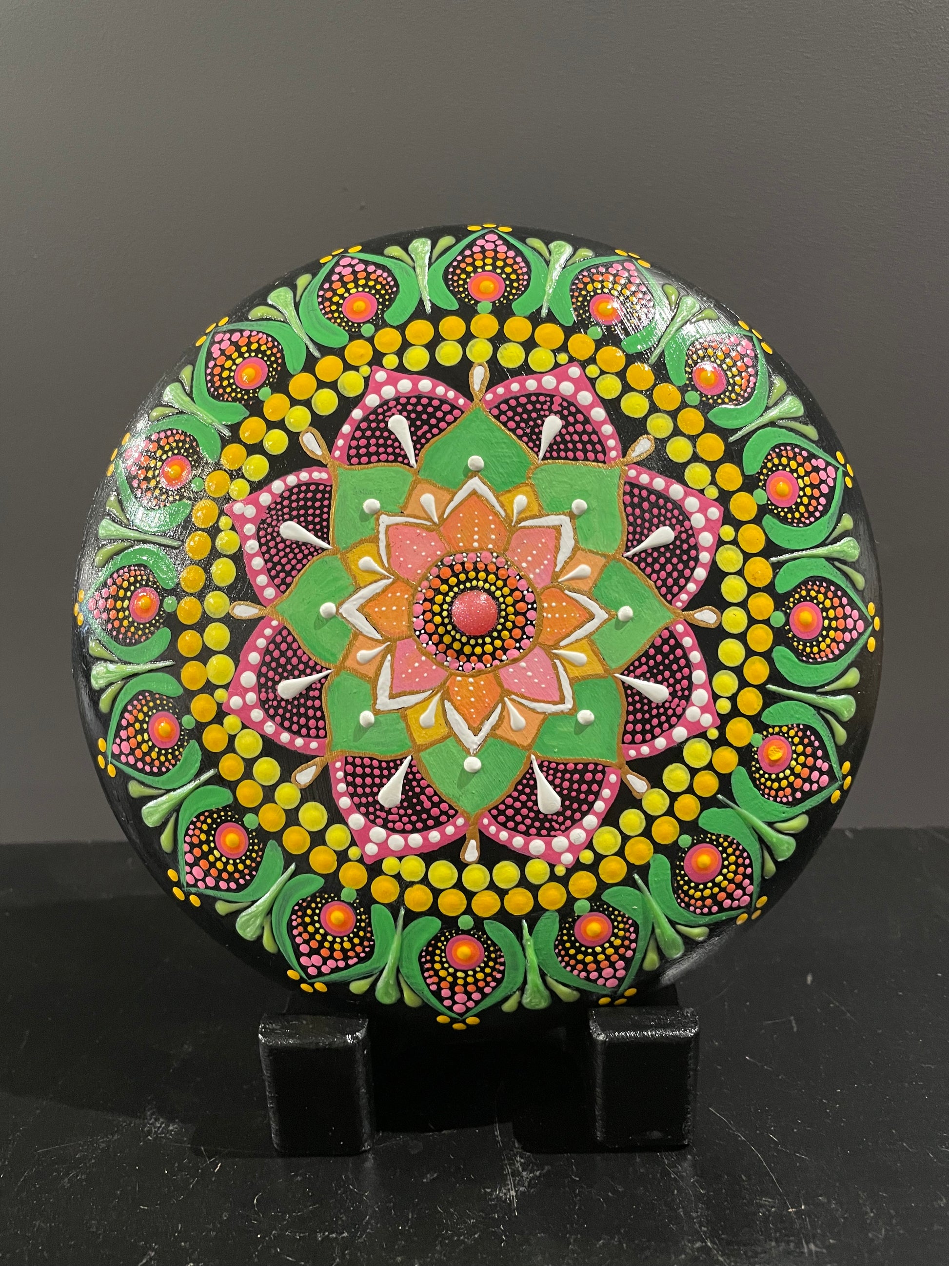 This playful cast stone sculpture by Antoinette Raats is sure to brighten up any space with its colorful acrylic dot art. Let the whimsical design of Dahlia add a touch of fun and quirkiness to your home decor.