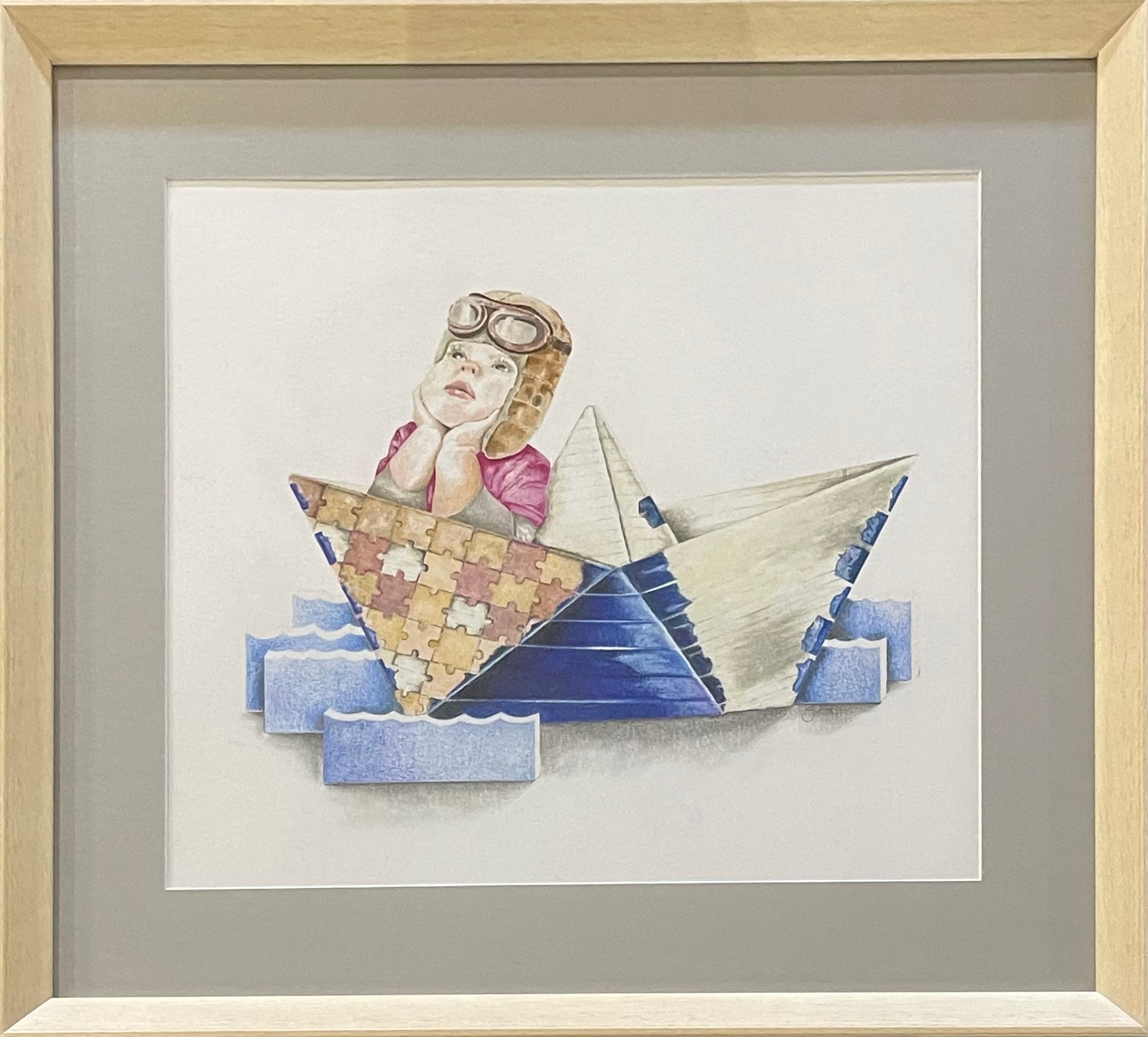 The Day dreamer II is a beautiful color pencil drawing by Surita Goosen, featuring a little boy serenely sitting in an origami boat. With intricate details and vibrant colors, this artwork will transport you to a daydream. Perfect for art lovers and those seeking a moment of tranquility.