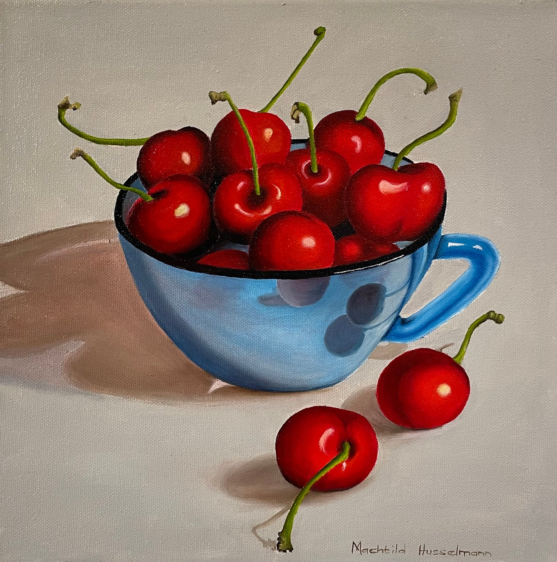 This exquisite Teacup Treat features a captivating oil painting by Machtild Husselmann. The blue tea cup brimming with cherries is a stunning addition to any home or office decor. The intricate details and vibrant colors make this piece a true work of art. Elevate your space with this one-of-a-kind treat.