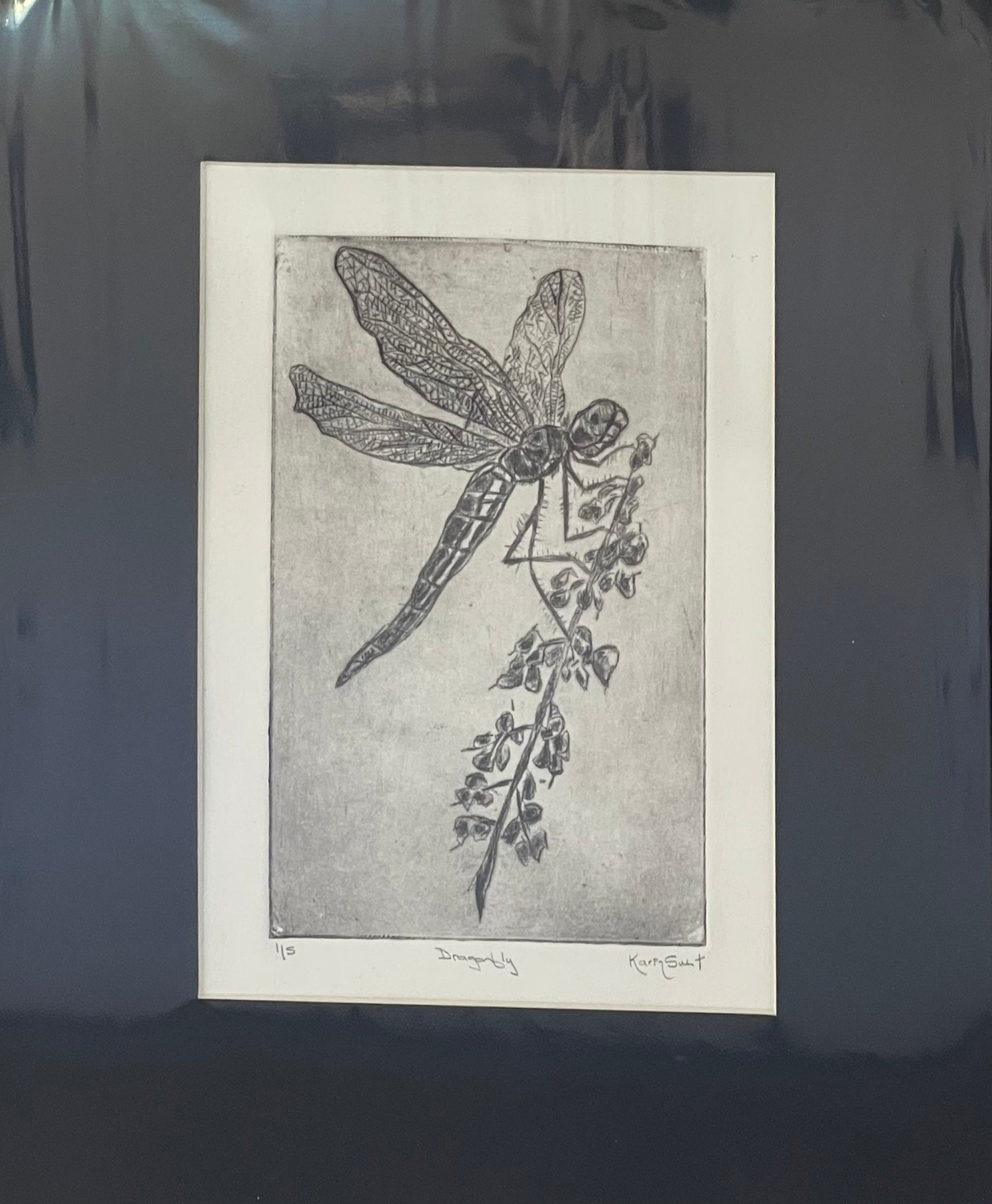 Indulge in the whimsical beauty of Dragonfly. This exquisite piece features a dry point etch of a dragonfly delicately perched on a flower, expertly printed on Fabriano paper. Add a touch of nature and artistic elegance to your home.