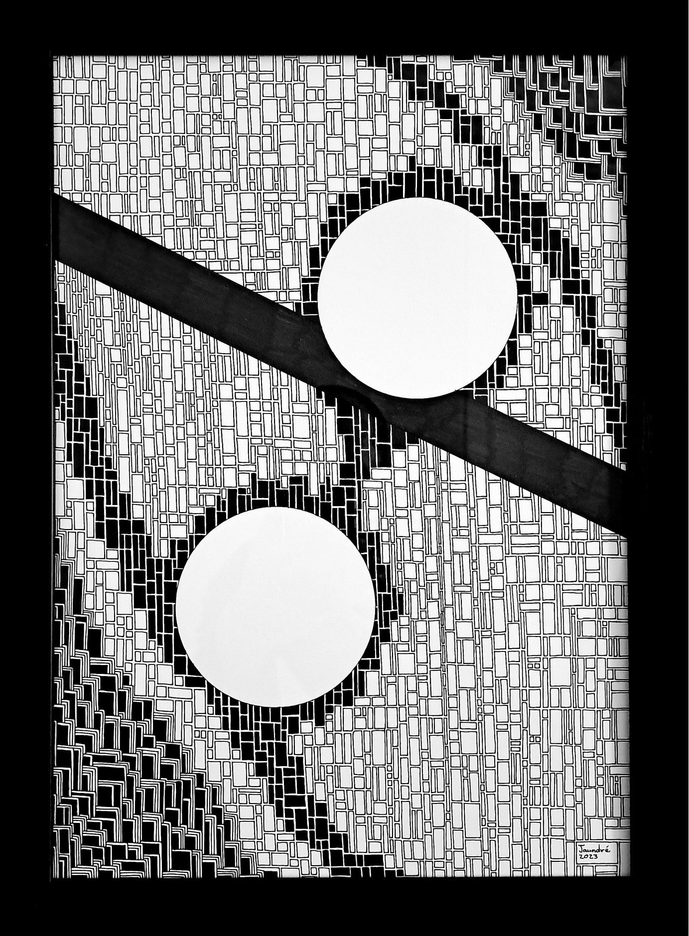 This conceptual abstract composition, titled "Duality (2023)", is a stunning piece of artwork created by renowned artist Jaundré van Breda. Using pen and ink, van Breda has expertly crafted a thought-provoking and visually captivating piece that will add a touch of sophistication and intrigue to any space.
