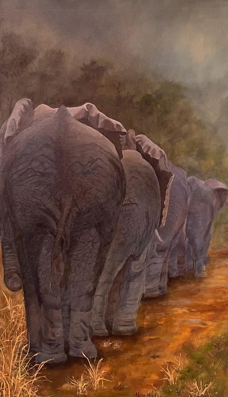 Observe the majestic beauty of the natural world with "Elephants marching on", a stunning oil painting capturing a herd of elephants walking beneath a dramatic and stormy sky. Expertly crafted with intricate details, this painting is a must-have for any nature lover's collection.