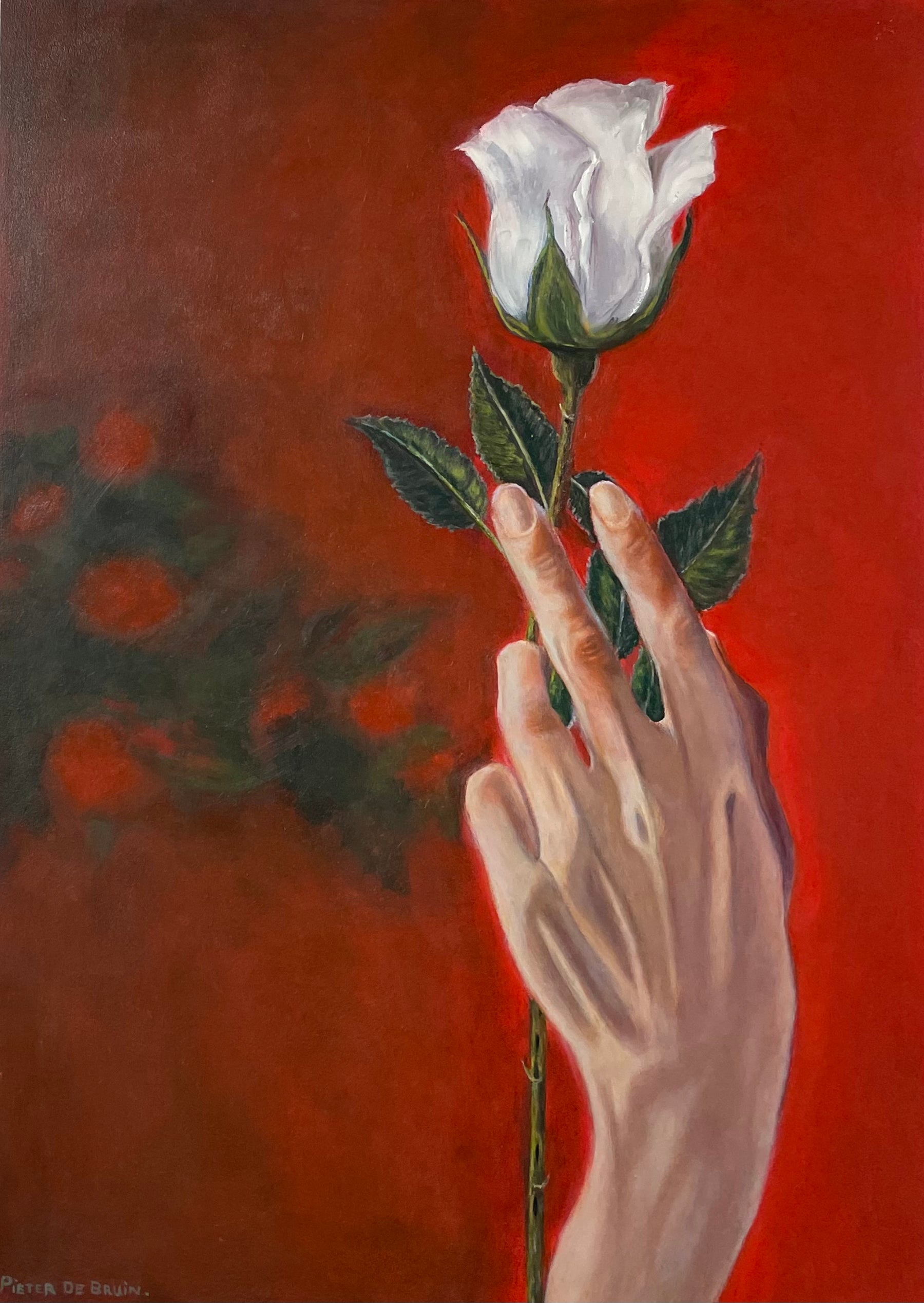 Experience the beauty of nature with Pure Life, an oil painting by Pieter de Bruin. Featuring a gentle hand holding a white rose by the stem, surrounded by vibrant green leaves. Perfect for adding a touch of elegance and tranquility to any space.