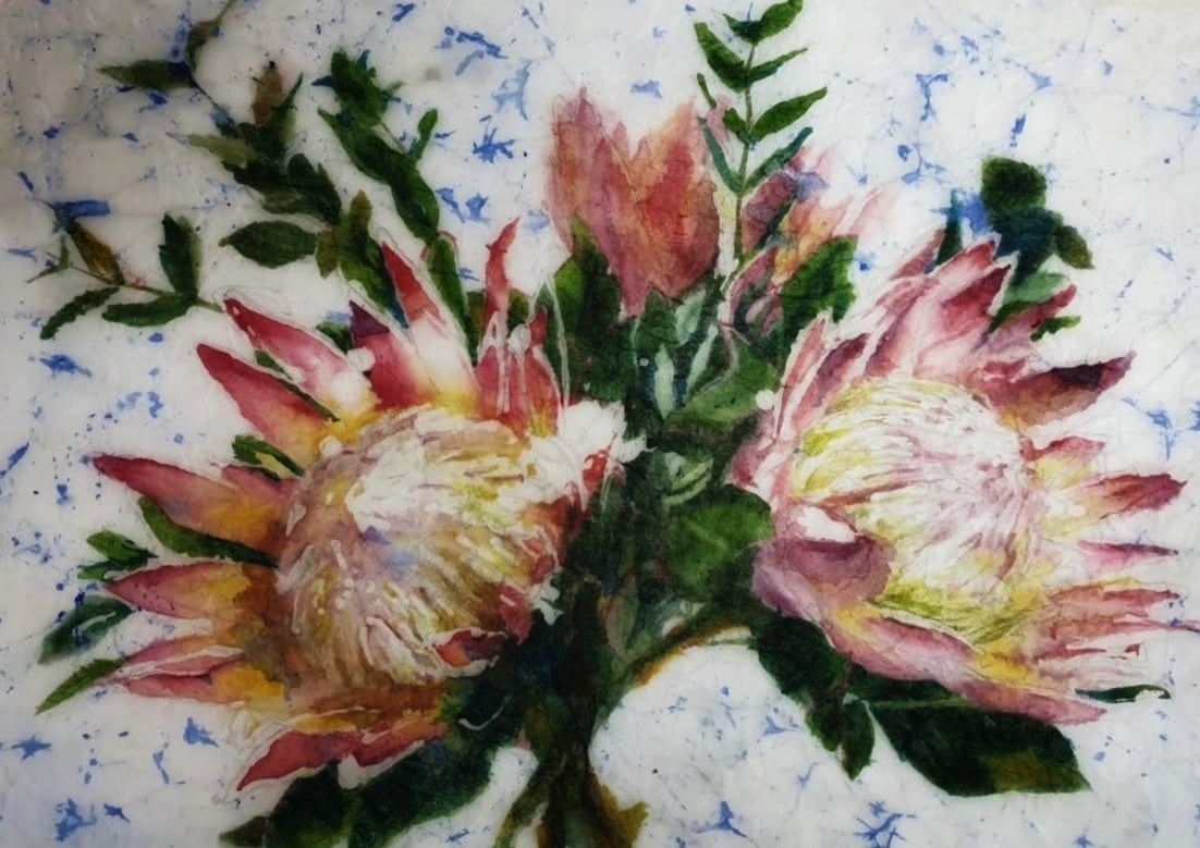Dive into the bold allure of "Enduring," a watercolour batik artwork that captures proteas in vivid colour. This piece channels nature's resilience and vibrant spirit, transforming any space with its striking blend of fluid colour and textured detail. "Enduring" celebrates strength, beauty and delicacy, the best South Africa has to offer..