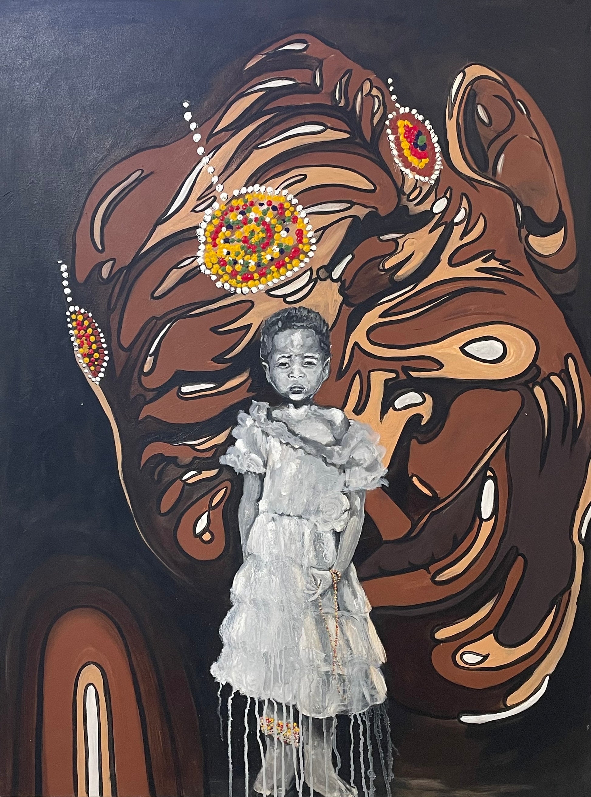 This painting, "Erfenis in my krale," by Michaelangelo Abrahams is a powerful portrayal of a little girl, rendered in grey tones, juxtaposed against a colorful portrait adorned with beads. Through the use of mixed media, Abrahams captures the contrast between the girl's vulnerability and the cultural richness of her surroundings.