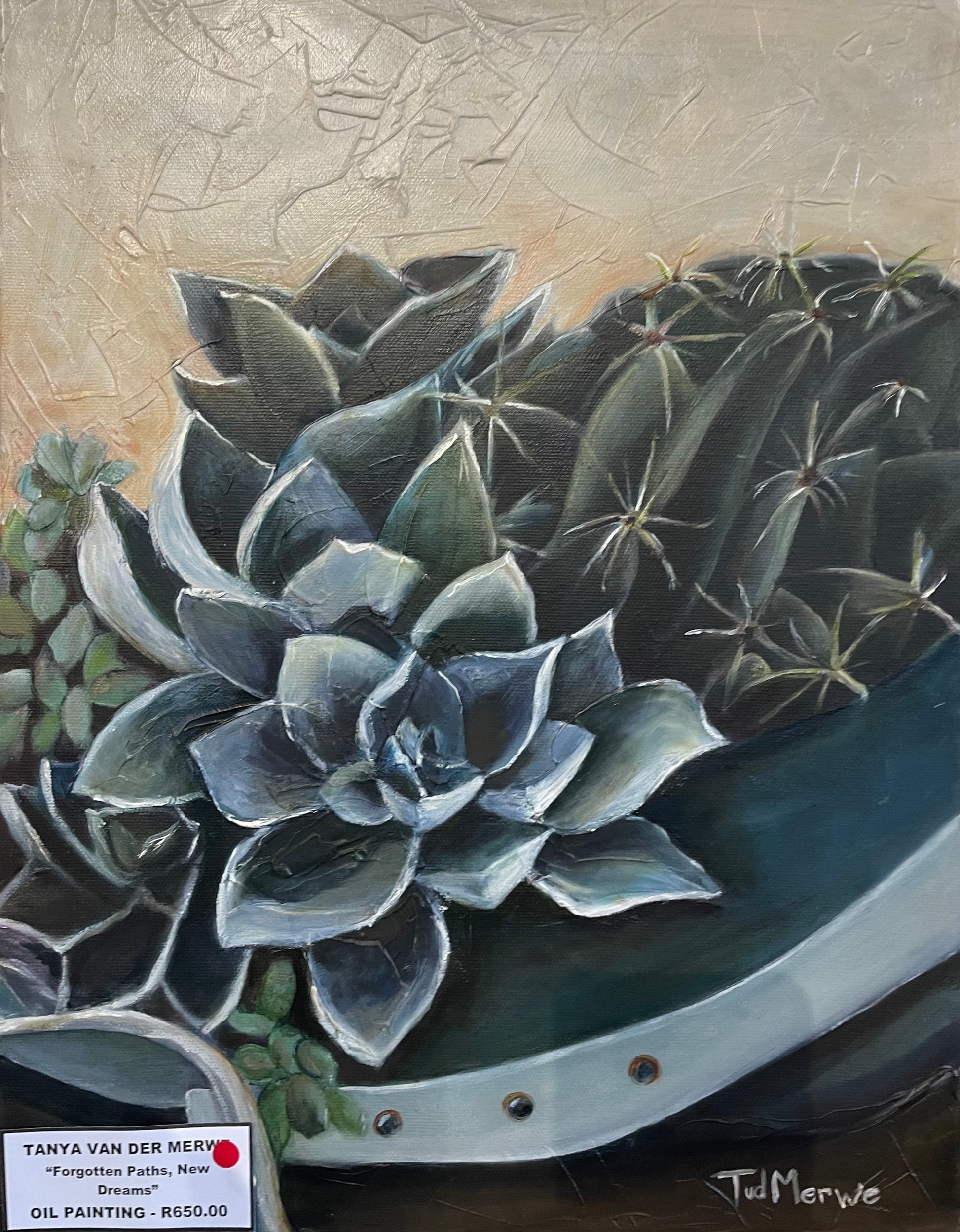 This oil painting by Tanya van der Merwe captures the beauty of still life, featuring a collection of succulents. Here, the delicacy and vibrancy of oil paint bring this subject to life in a unique way. Discover the intricate details of each succulent, while adding a touch of nature to your home or office space.