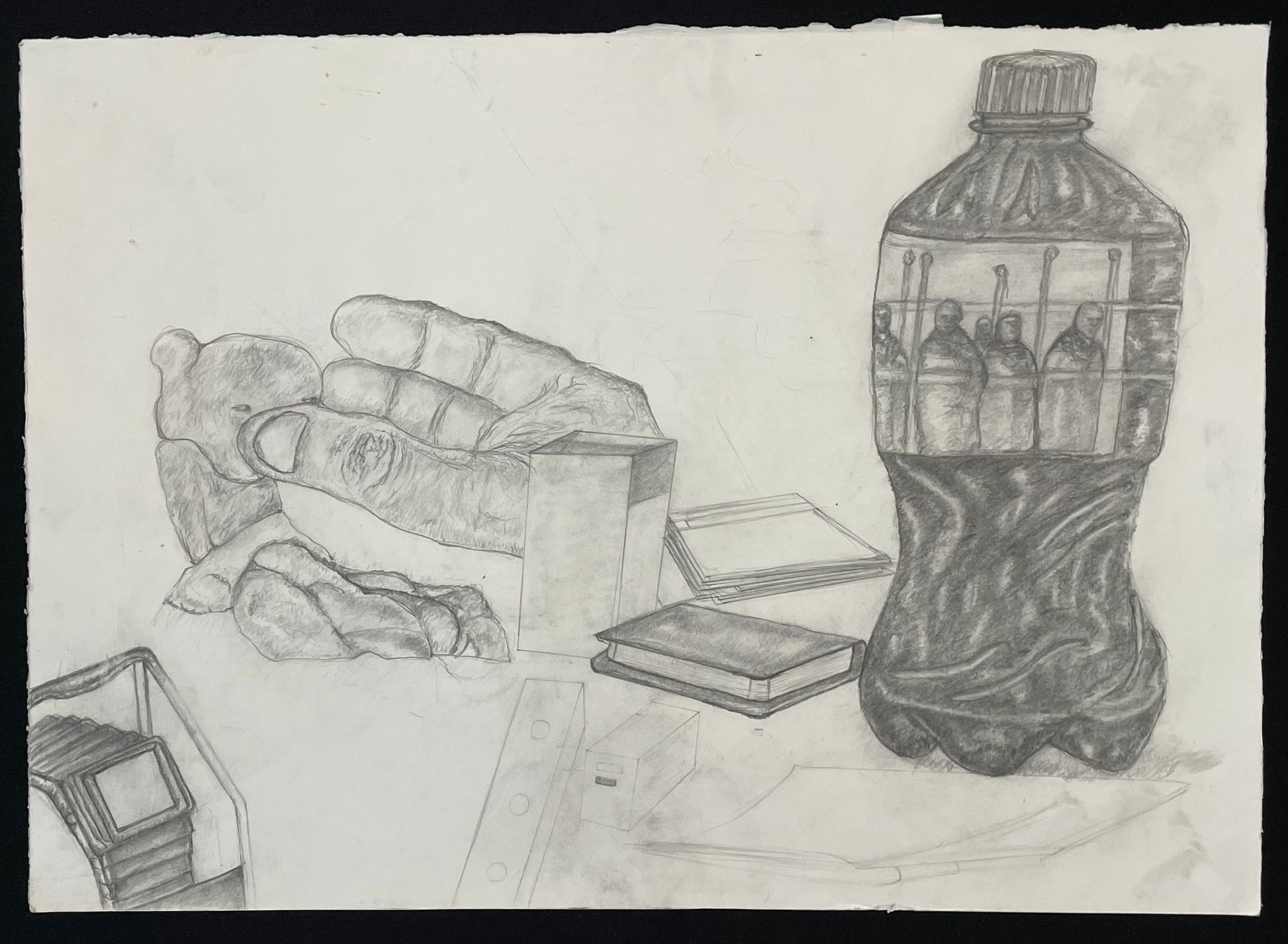 Experience the timeless elegance of "From a small age" - a stunning still life graphite drawing by Shimane Seemise. Transport yourself to a nostalgic world as you admire the intricate details of a watch, books, and a hand holding a teddy bear. Let the pareidolia-inspired artwork bring a touch of sophistication to your space.