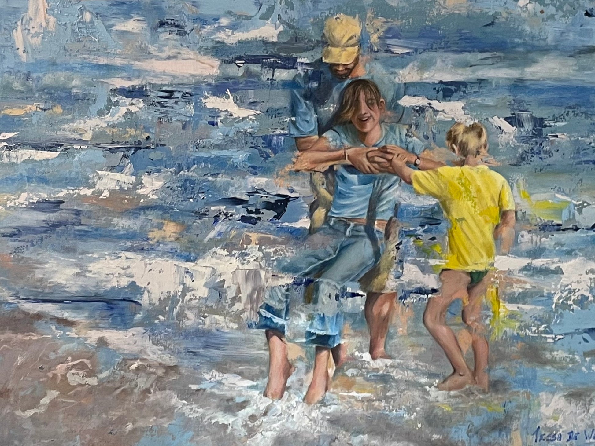 Let this oil painting of three children playing bring some sunshine and laughter into your home. As their happy figures fade into an abstract ocean backdrop, it's a playful reminder to embrace the carefree moments in life. Perfect for any art lover or anyone in need of a smile.