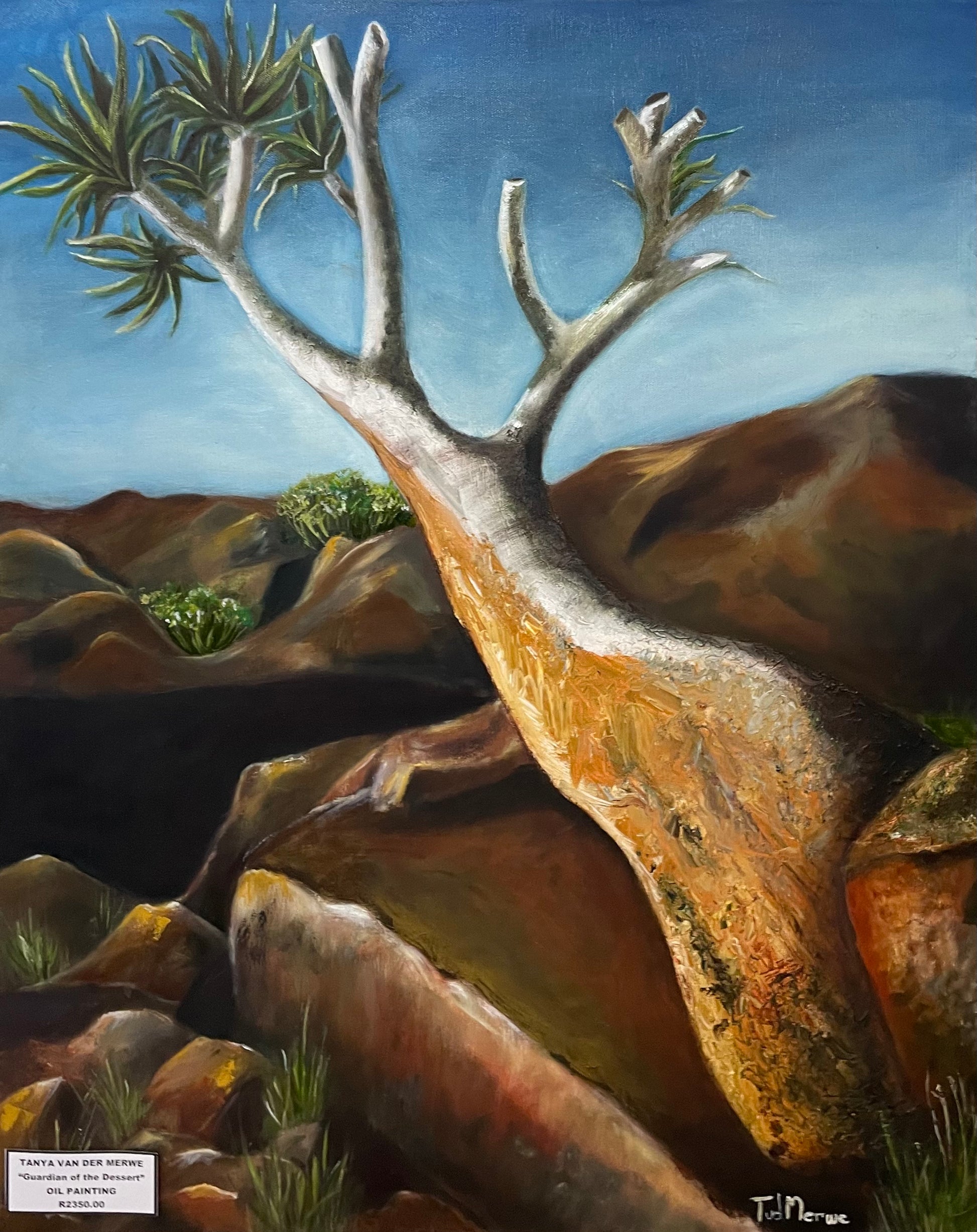 Expertly painted by Tanya van der Merwe, Guardian of the Desert depicts the strength and resilience of a thriving plant among the harsh rocks of the desert. The contrast between the fragile plant and the tough environment captures the beauty and wonder of nature.