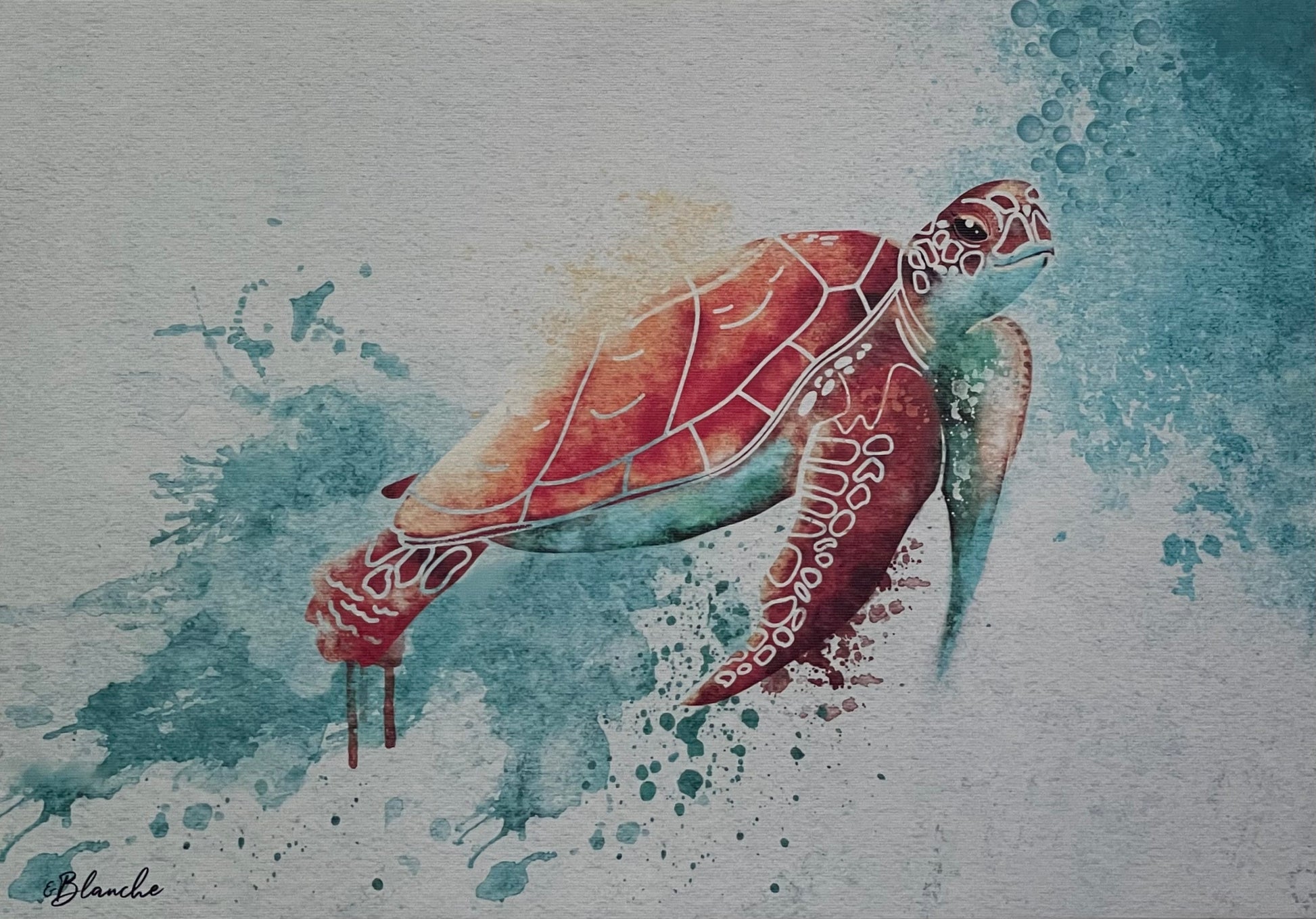 This stunning digital artwork print on canvas captures the grace and beauty of a sea turtle gliding through the splashes of water. Elevate your home decor with this masterpiece by Blanche Price. Bring the tranquil energy of the ocean into your space and marvel at this majestic creature.