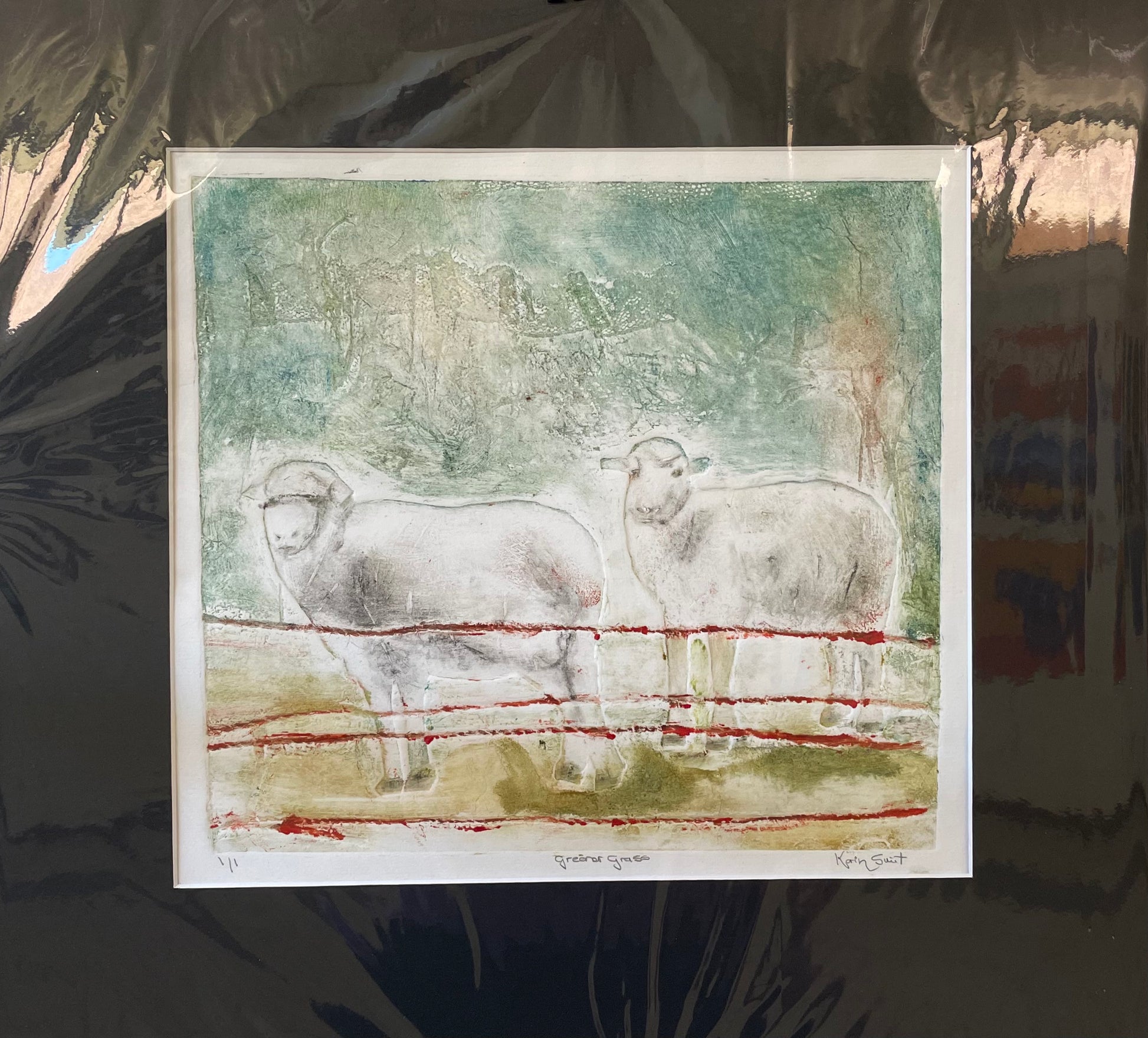 Experience the thrill of risk-taking with Greener Grass, a stunning collagraph print by Karin Smit. Two sheep stand boldly behind a barbed wire fence, reminding us that sometimes the grass truly is greener on the other side. Add a daring touch to your space with this unique piece!