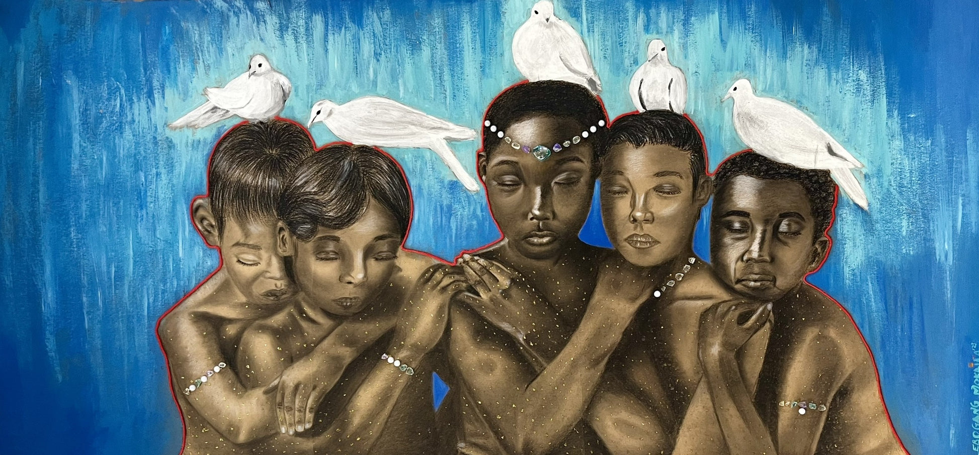 A painting with religious undertones of a rite of passage among African children. With symbolism of innocence and peace.