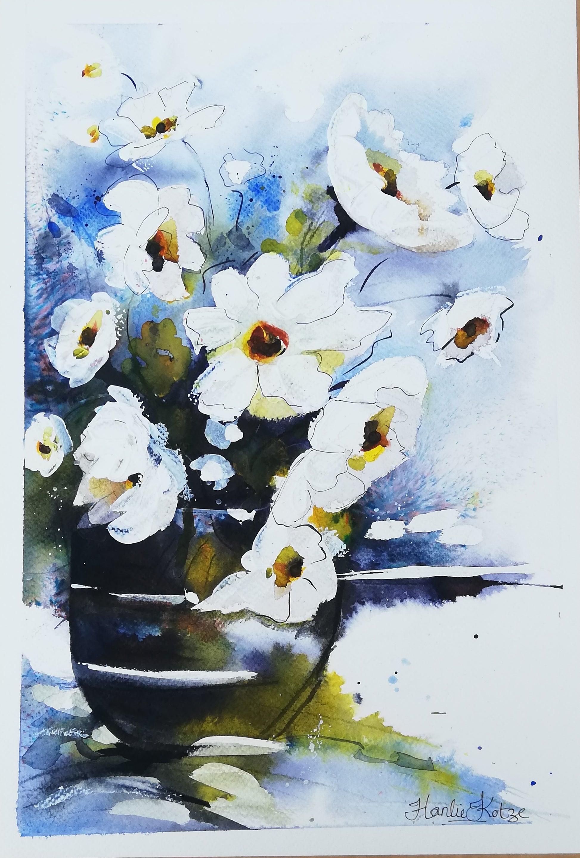 Celebrate joy with this playful painting featuring white flowers in a loose, carefree style. Its soft, flowing brushstrokes invite you to embrace creativity and happiness every time you glance at it. Perfect for brightening any space with a lighthearted touch.