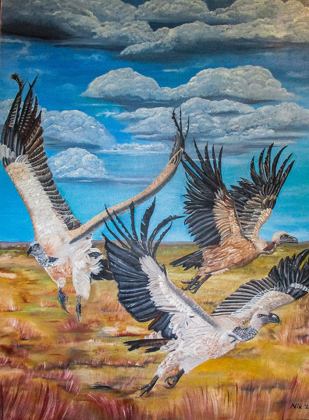 This expert painting, "Hear our Cry: Cape Vulture," captures the striking presence of Cape Vultures as they search for food. The artwork highlights the species' critical role in the ecosystem, emphasizing their majestic form and natural behavior. Ideal for conservation enthusiasts and art collectors alike, this piece brings attention to the importance of protecting these remarkable birds.