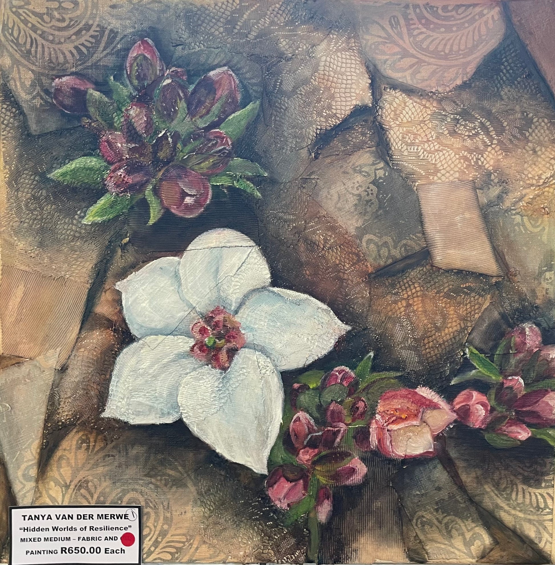 Discover the hidden worlds of silence with this bold oil painting by Tanya van der Merwe. Blossoms and lace come to life in a vibrant display, inspiring you to take risks and explore new adventures. Add this unique piece to your collection today!
