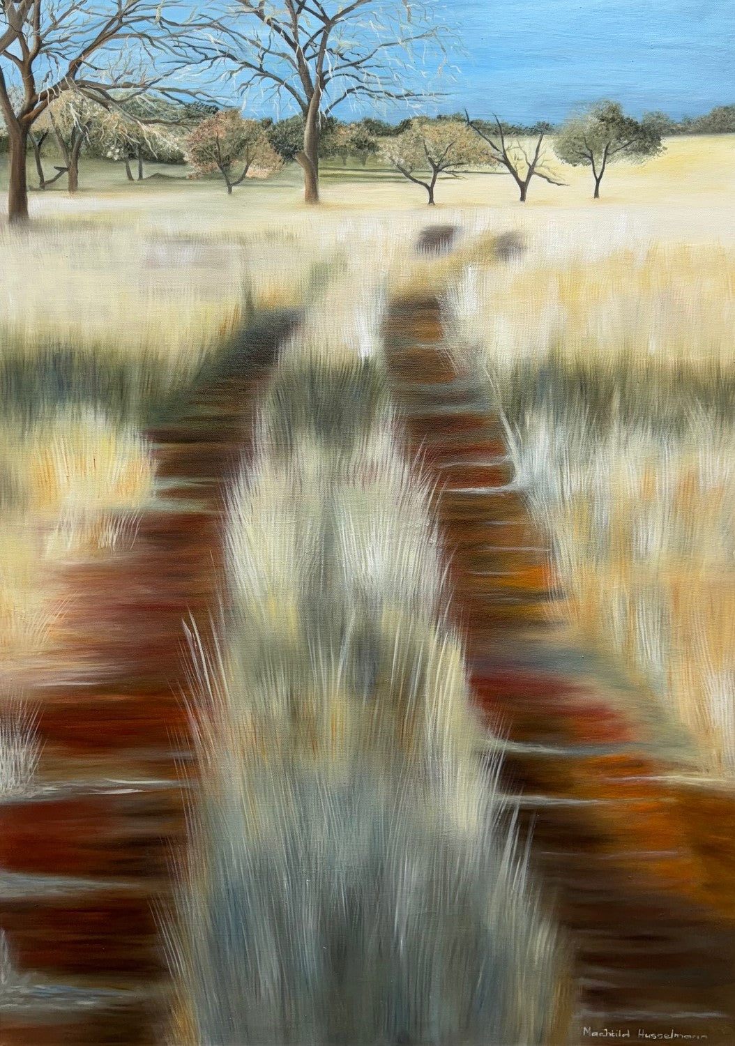 Experience the beauty of the open veld with Homeward bound. This stunning oil painting by Machtild Husselmann captures a tranquil landscape of a two track gravel road nestled in tall grass. Add a touch of nature to your home with this expertly crafted piece.