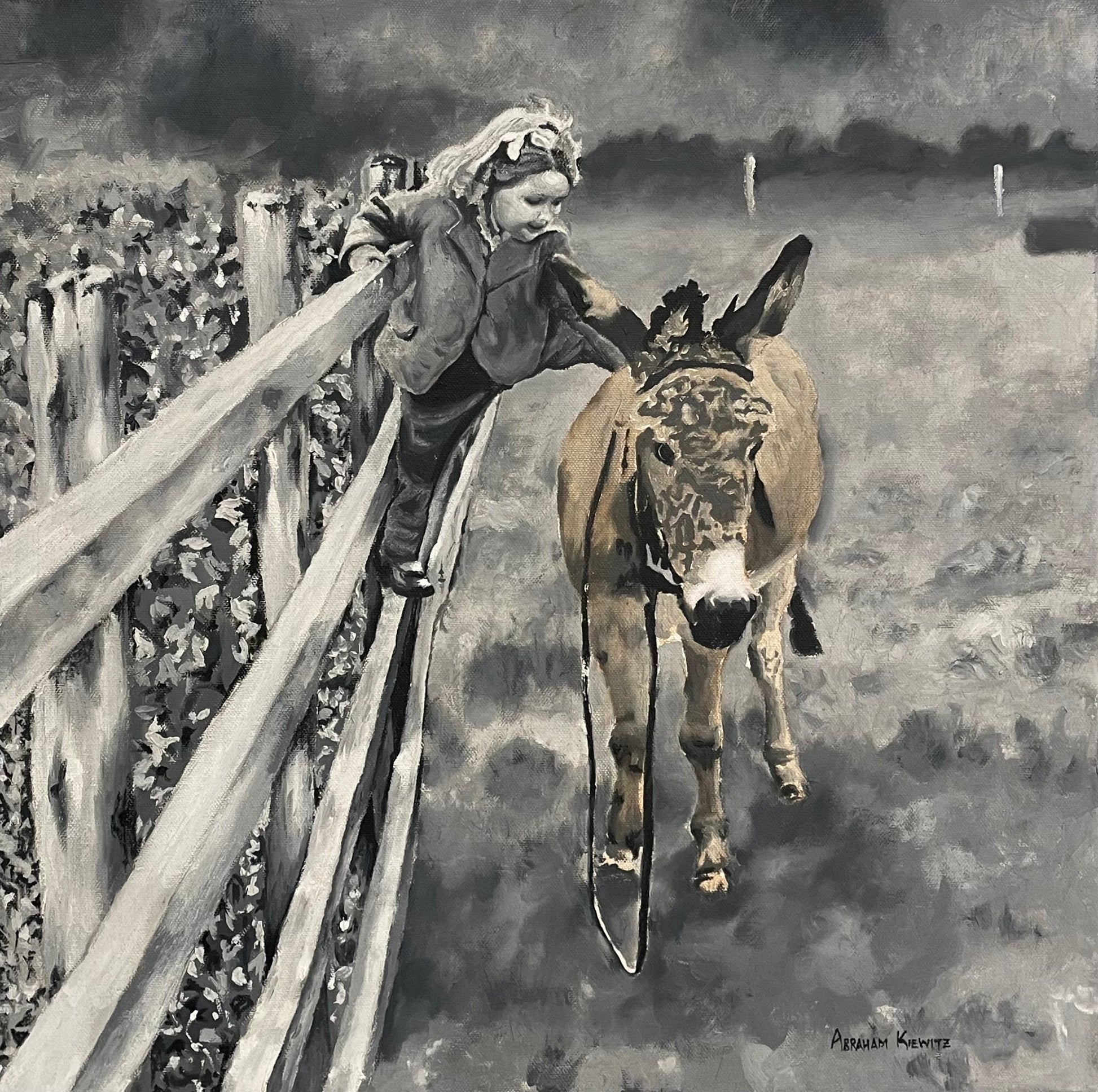 Elevate your space with "I can do it," an exquisite oil painting by Abraham Kiewitz. This beautiful piece captures the determination of a little girl trying to climb atop a donkey from a fence. Let its artistic charm and metaphorical messaging inspire you to conquer your own challenges.