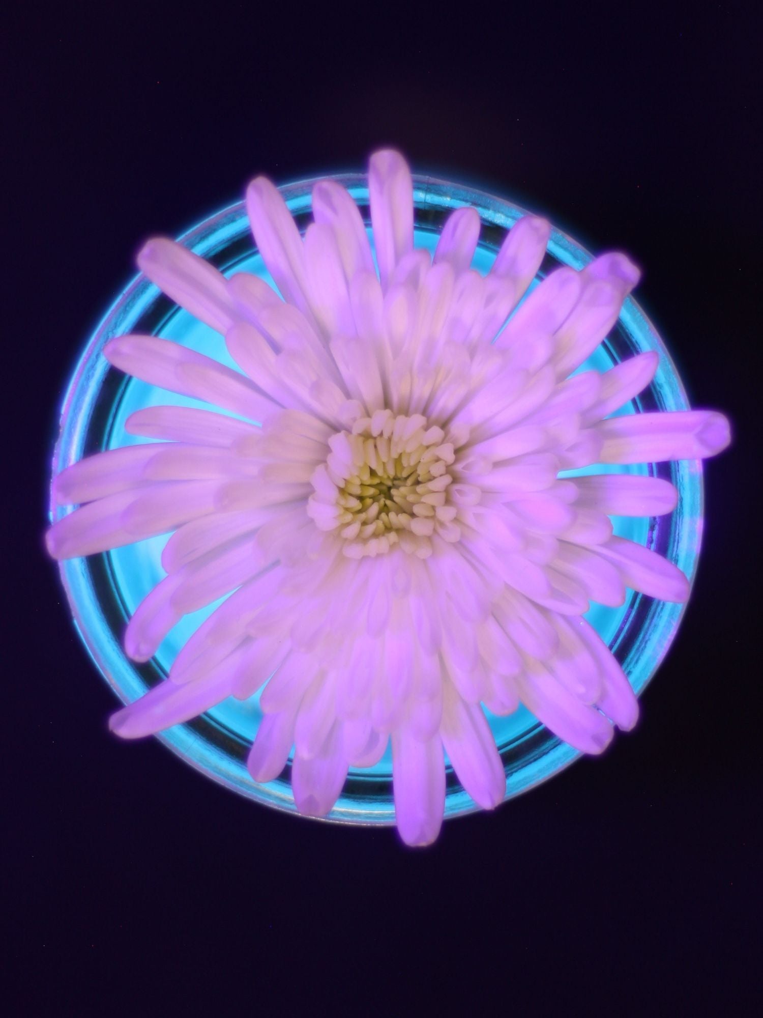 A playful photographic image of a daisy. In this image the photographer took the photo of the flower in a glass container with special fluid (tonic water) that was illuminated with a UV light from above to get this special image.