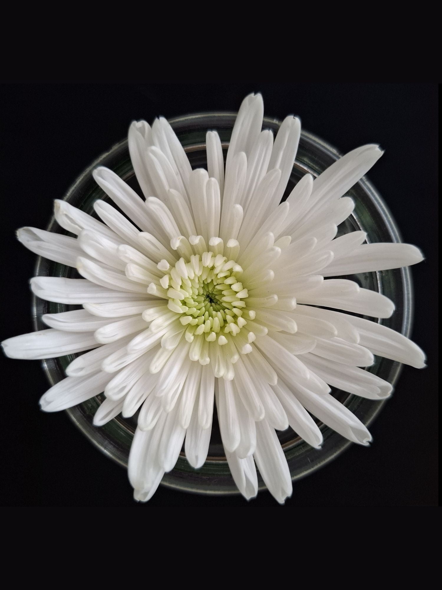 A playful photographic image of a daisy. In this image the photographer took the photo of the flower in a glass container with special fluid but no additional or special illumination was used.
