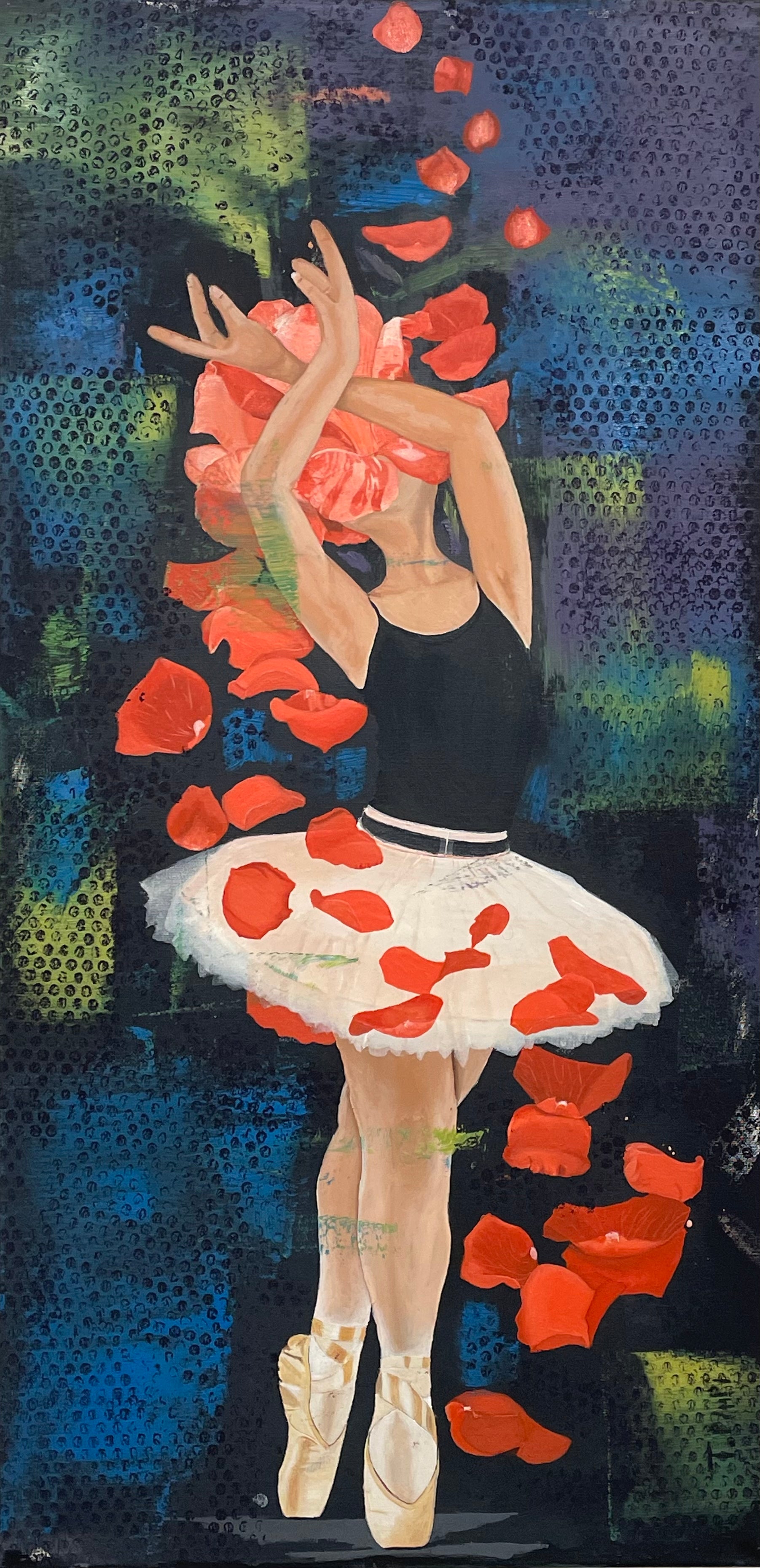 Discover beauty and grace with "In your zone" - a stunning oil painting capturing the essence of a ballerina's dance. Artist Tshegofatso Pimpi portrays the dancer with delicate swirls of flower petals and elegant arm movements, creating a captivating masterpiece. Bring the power and emotion of dance into your home with this one-of-a-kind painting.