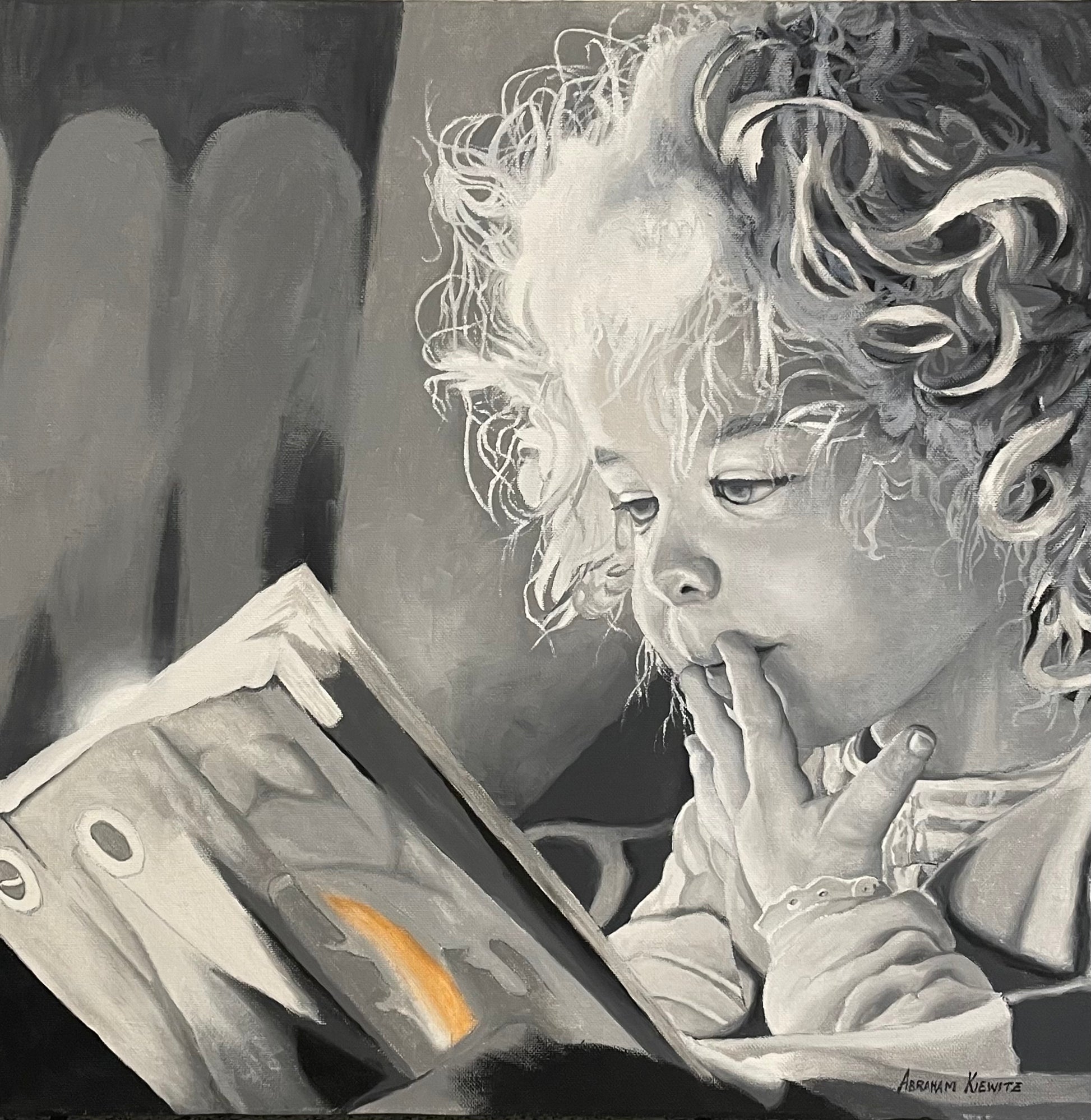 Experience the purest form of joy with this monochrome oil painting featuring a little girl engrossed in a book. Add a touch of whimsy to your space and let the portrait by Abraham Kiewitz remind you of the simple pleasure of reading.