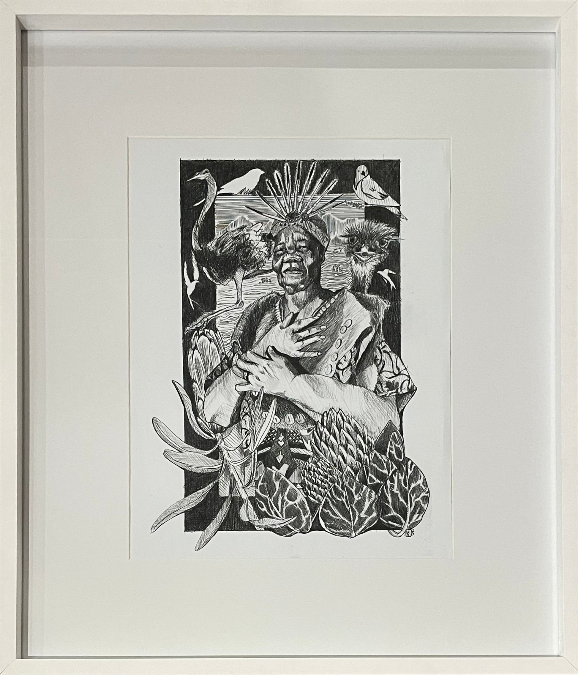 Discover the story of Katrina Esau, the last speaker of Nluu language of the San people in South Africa, through this stunning pen portrait by Michaelangelo Abrahams. Surrounded by ostriches, birds, and proteas, learn about the rich culture and history of this endangered language.