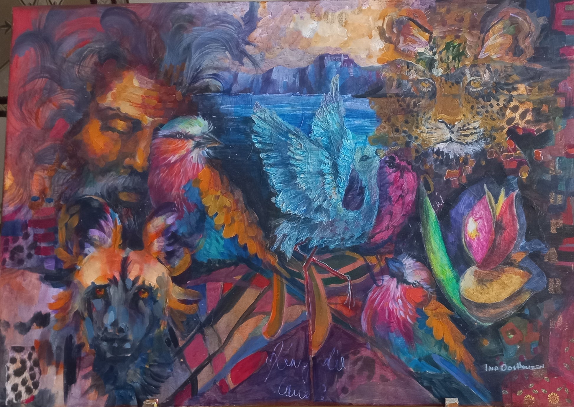 To explain “Local is lekker” in the painting, I chose to paint the “lekker” things I like to do: bird watching; game drives, nature and to appreciate the wide diversity and variety of species in our country. To be able to do just that, God has appointed man as the guardian of all this beauty – the male image represents divinity and guardianship.