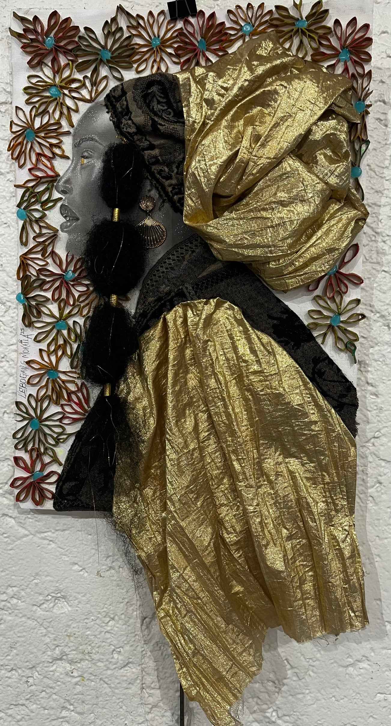 Embrace the enigmatic beauty of "Kgosigadi," a captivating artwork featuring an African female silhouette draped in shimmering gold cloth. This playful yet mysterious piece invites viewers into a world where tradition meets imagination.