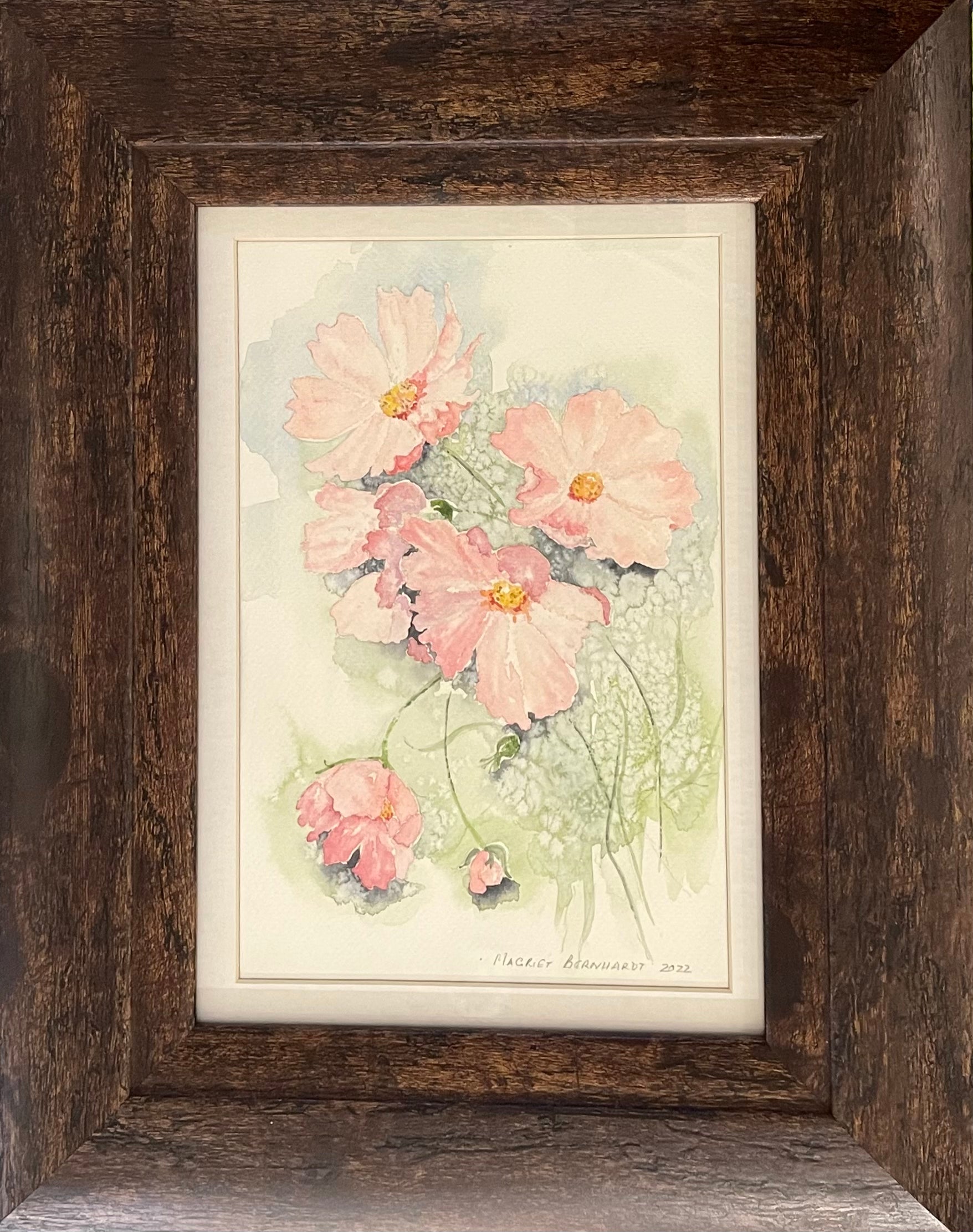 Indulge in the stunning beauty of Kosmos with this watercolour by Magriet Bernhardt. Each brushstroke captures the essence of this flower, perfect for any nature lover. Bring a touch of elegance and tranquility into your home with this beautiful piece of art.